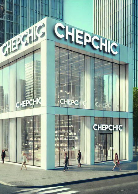 промт: create a white store building with glass transparent windows for the Chepchiс brand in an urban environment in a minimalist style, the building should have a vector minimalist logo, the logo should have a beautiful font with the name of the Chepchiс brand, the font should have a minimum number of openwork and thin lines, the font should be with serifs and nice graceful corners