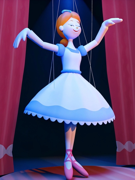 Промт для Leonardo.ai: A poster for a puppet theater for 3D render stylized game with the title «The Puppet Show». The name is in the upper part in large thick white letters. The poster depicts a scene illuminated by safeties with a crimson curtain. There is a girl with orange hair in long blue dress with puffed sleeves and pink shoes. She is sitting on human hand. On the background there are crimson custains, background is blurred. Shades of blue, light blue and pink, yellow color accents. The light is blue, lilac with a haze.