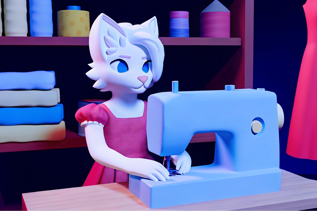 Промт для Recraft.ai: Little white 3D render cartoon stylized cat with blue eyes and short silver hair in pink dress is sitting behind big blue sewing machine/ she is sewing a dress. The sewing machine is standing on wooden table. Behind the cat there are shelfs with cloth and many colorful boxes. A lot of details: pieces of cloth, spools of thread, needles, books, boxes, hats everywhere.