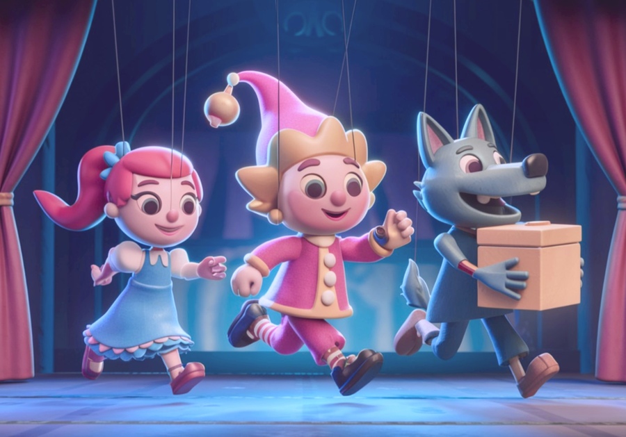 Промт для Ideogram.ai: Графика для стилизованной под 3D рендеры видеоигры о маленьких куклах в кукольном театре. На изображении 3 куклы бегут через сцену под светом сафитов. Первая бежит кукла маленькой стройной девочки с рыжими волосами и голубым платьем. У нее платье в пол с объемными короткими рукавами и большим бантом на спине. Из под платья выглядывают розовые туфельки. За ней весело бежит кукла арлекина в розовом костюме с помпонами и шапке с бубенцами. Вслед за ними последним идет кукла волка и несет в руках коробки. Его шерсть голубоватого оттенка, на нем темно-синие штаны и тельняшка. Оттенки синего, голубого и розового, желтые цветовые акценты. Свет голубой, сиреневый с дымкой.