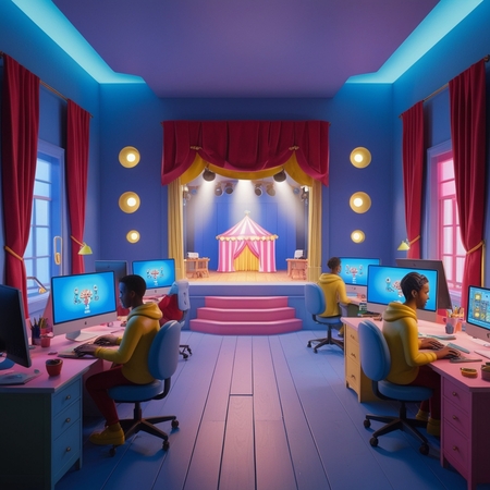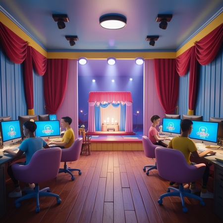 The interior of a small cozy game studio where a game about a little puppet theater is being created. The studio has several workstations for the employees, each with a computer. The walls are covered with crimson curtains. On the background there is a little stage with lights on. Shades of blue, light blue and pink, yellow color accents. The light is blue, lilac with a haze. It is a bit dark and main light comes from monitors and a little stage in the background.