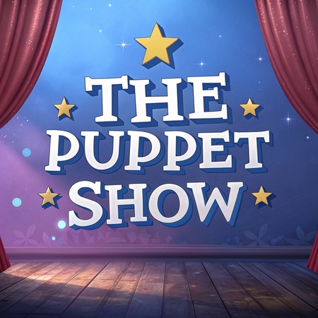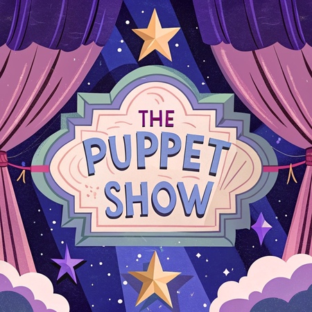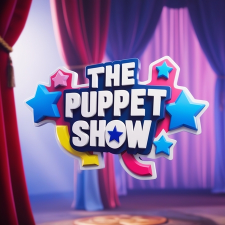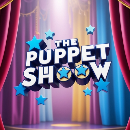 Промт: a logo for a game «The puppet show» about theater with thick letters and yellow stars around text. The background is blurred and has crimson curtains. Shades of blue, light blue and pink, purple. The light is blue, lilac with a haze.