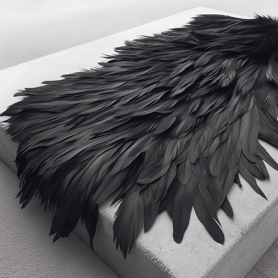 - A striking close-up monochrome fashion photography of the big black tote bag made of black feathers. The bag lies on a big concrete block. The overall atmosphere of the image is mysterious and captivating, inviting the viewer to appreciate the beauty of unconventional artistry., photo