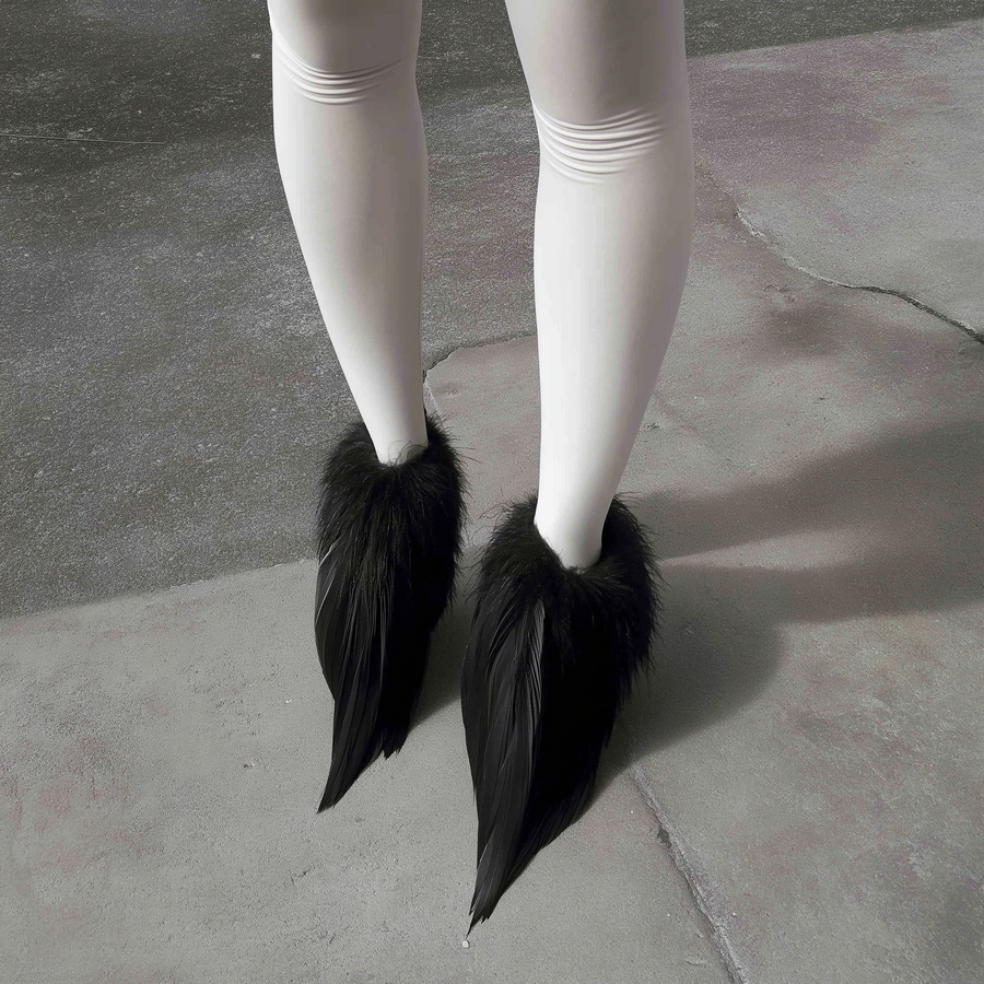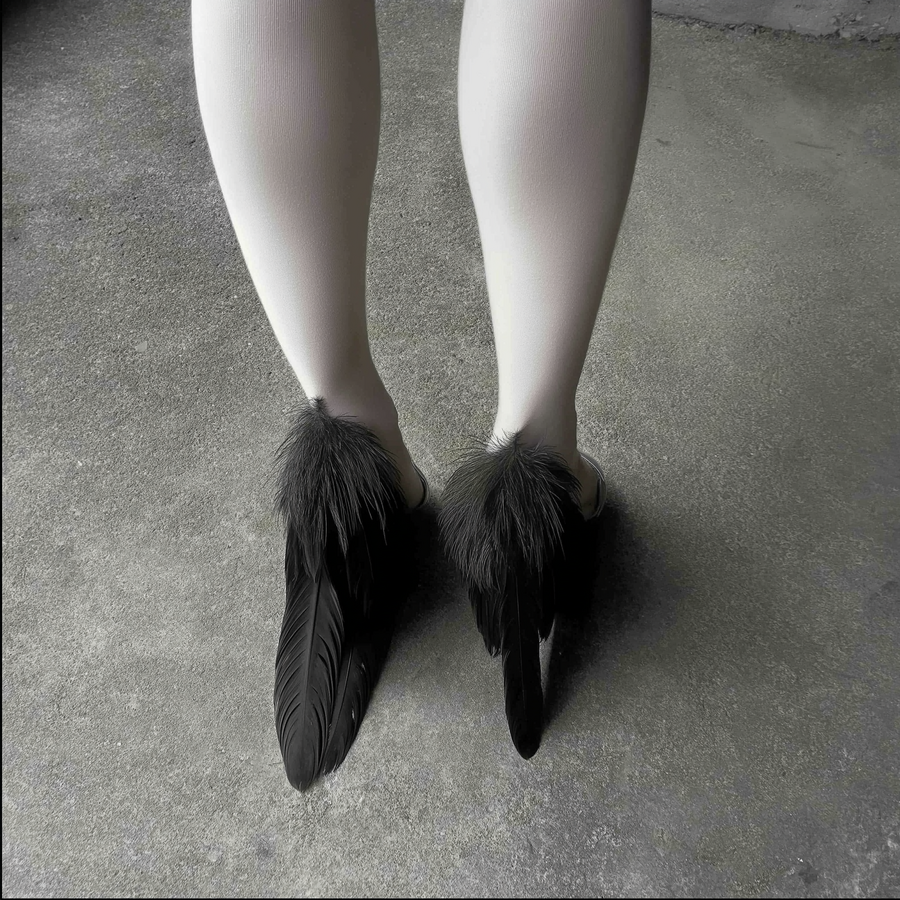 - A close up photograph of thin female legs in white tights on the concrete floor in avant-garde fashion surrealistic heels crafted entirely from black feathers. The feathers flow down the legs, adding to the overall bold and visually striking effect