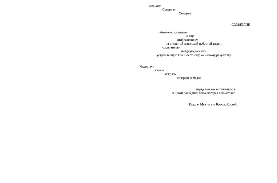 А вот формальные эксперименты Малларме можно было бы оспорить в их связи с представлением о лаконичности. «Привычная», линейная организация текста на первый взгляд делегирует на себя ту типизацию и интуитивность, о которых говорилось ранее, очищая текст от формальных изысков. Однако, как писал сам Малларме, его цель — «создать все заново с помощью реминисценций, чтобы подтвердить: мы именно там, где должны быть», т. е. восстановить означаемое не до его словесного выражения, а до него самого, до сущности: актом творчества заново расставить границы чувственного мира, пересобрать его деятельно, уравниваясь в этом с актом политическим. Новая разметка текста есть новая картина мира, — возможно, более точная и искренняя, чем привычная строчная запись.