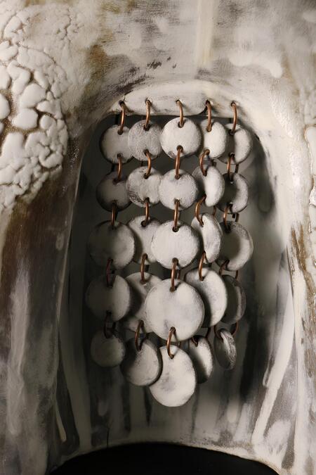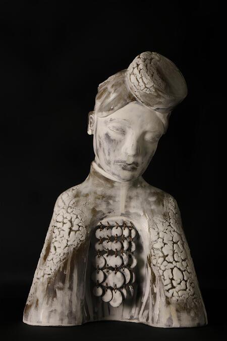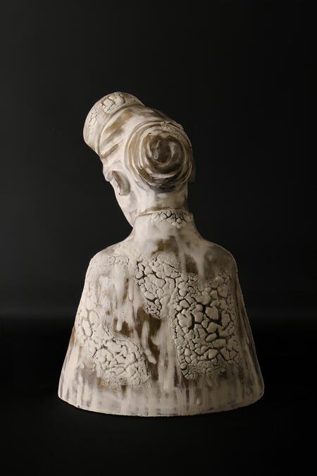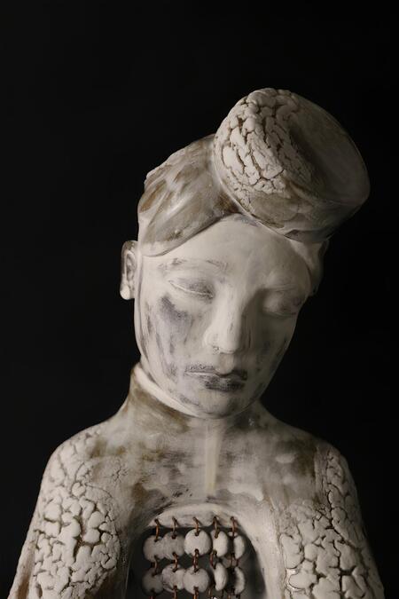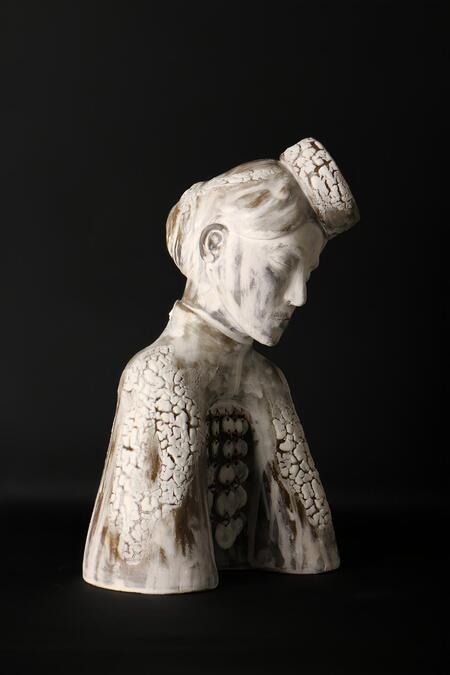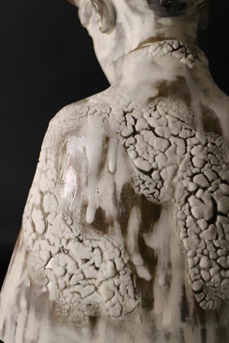 Подтеки и трещины глазури на скульптуре напоминают о краске на старых зданиях, которую наносят слой за слоем много лет, что подчеркивает, что эта тема, несмотря на свою историческую основу, продолжает оставаться актуальной и значимой в современном обществе.