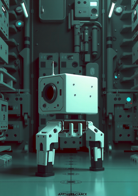 Промпт: Create a poster for the video game ’Zaryad, ’ featuring a minimalist logo and a 3D-rendered robot. The robot is small, with a cubic white head, a rounded black camera eye, and two legs. It is standing on the floor of a sci-fi laboratory, resembling an Aperture Science test chamber or a ’Love, Death & Robots’ void. The background should consist of cyberpunk-style digital greebles, a robotic platform, and a futuristic, high-tech atmosphere. Render using Octane or Redshift, focusing on a mix of green, white, and black tones only. The poster should balance the clean, minimalistic design of the logo with the intricate details of the robot and environment.