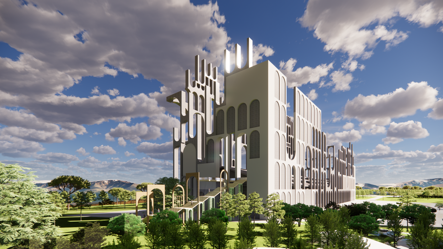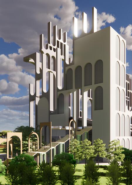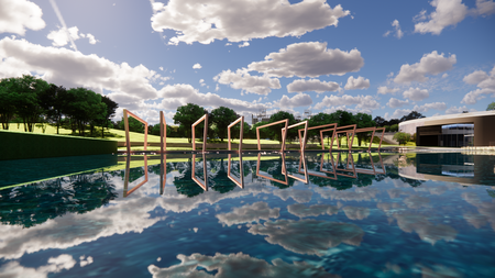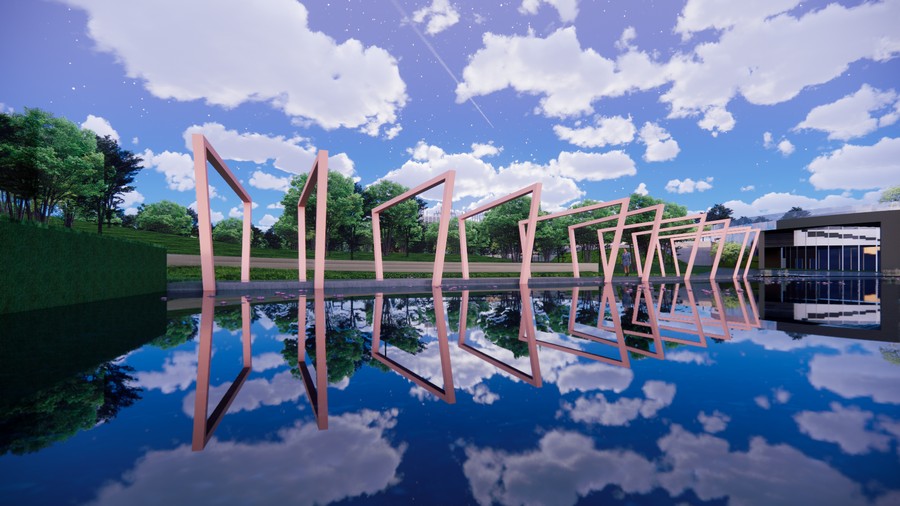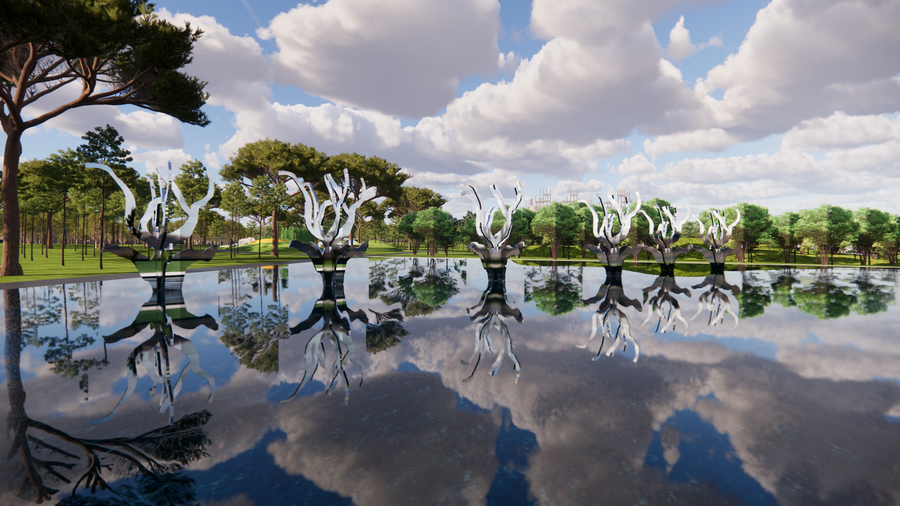 Форма арт-объектов вдохновлена корневыми скульптурами М. Матюшина. Их размещение в воде метафорически перекликается с концепцией архитектурного фасада, который состоит из арок, визуально напоминающих перетекание неба и земли.