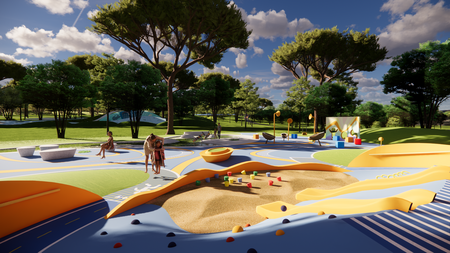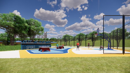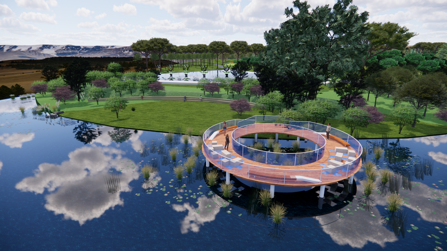 Пространственное зонирование территории: 1. зона выставочного зала («манеж», смотровая площадка, беседка) 2. прогулочная зона (мост, пруды, арочные туннели, беседка, арт-объекты) 3. зона ресторана (ресторан, терасса со столиками, смотровая площадка) 4. лодочная станция (лодочная станция, смотровая площадка, арт-объект) 5. зона амфитеатра (амфитеатр у воды, арт-объекты) 6. зона пруда (пруд, смотровая площадка) 7. детская зона (детская площадка № 1, детская площадка № 2) 8. зона для занятий спортом (спортивная площадка) 9. зона для кемпинга (палатки, оборудованные места для разведения костра)