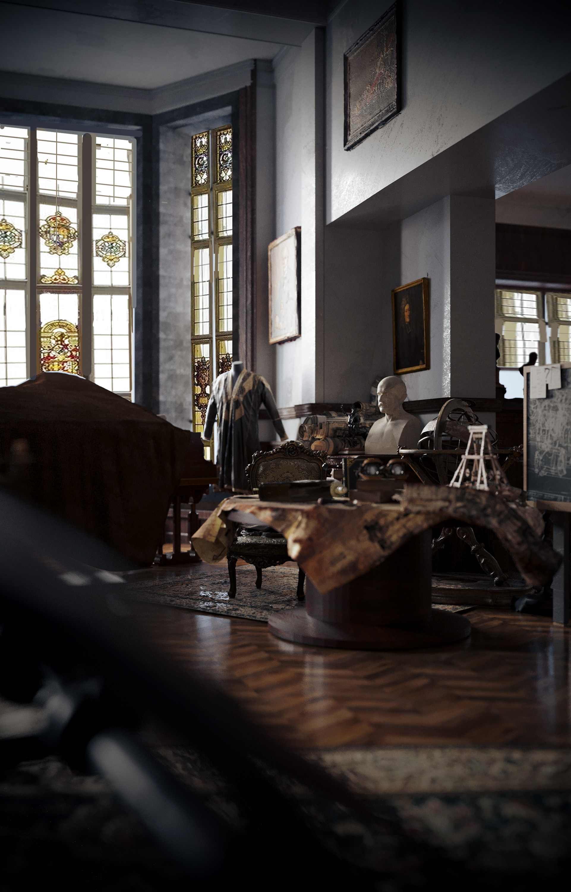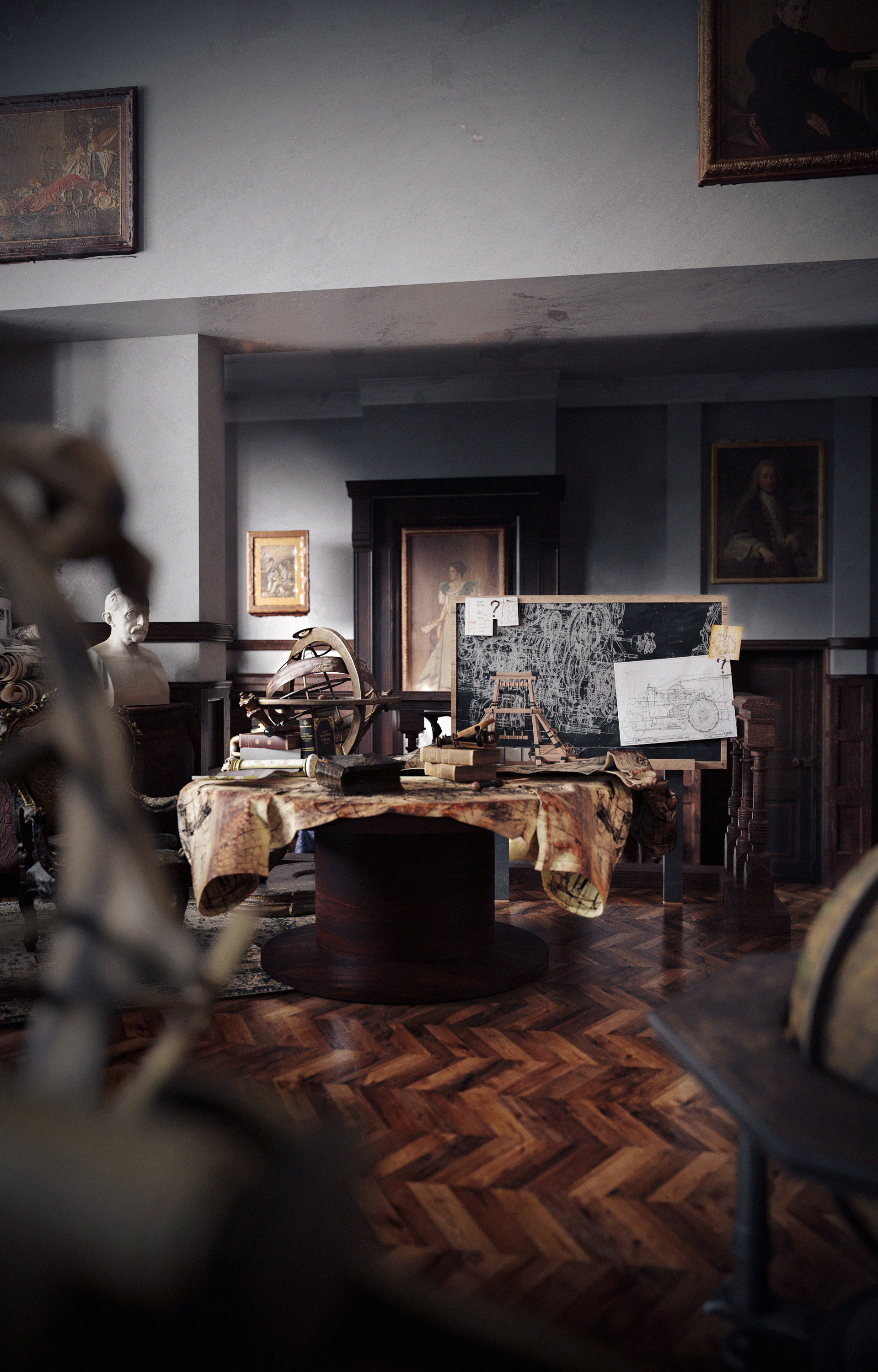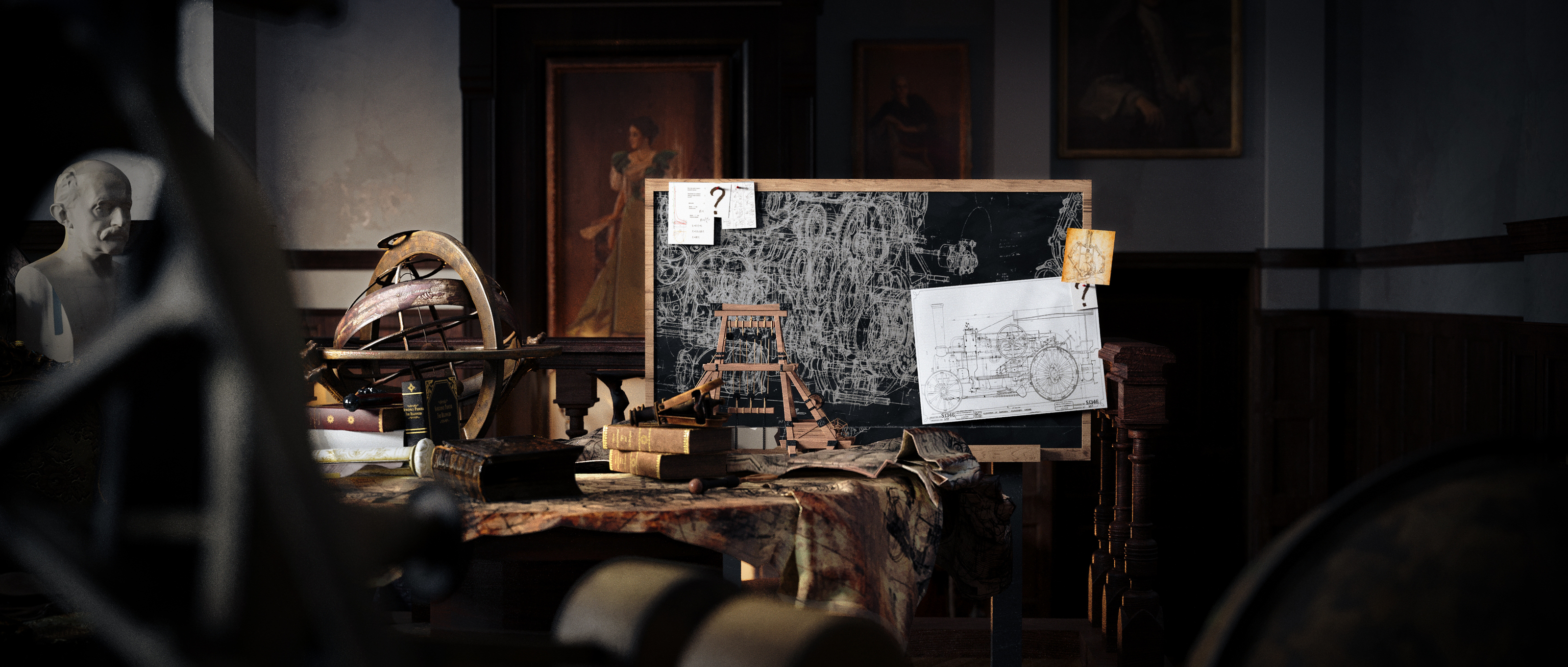 Слева от нас находится зона камина и мольберт с нарисованным портретом Ньютона, как дань уважения интеллектуальному гиганту прошлого. В глубине помещения мы можем увидеть небольшой склад механизмов. Здесь находятся ранние модели двигателей паровых машин, а также измерительные приборы