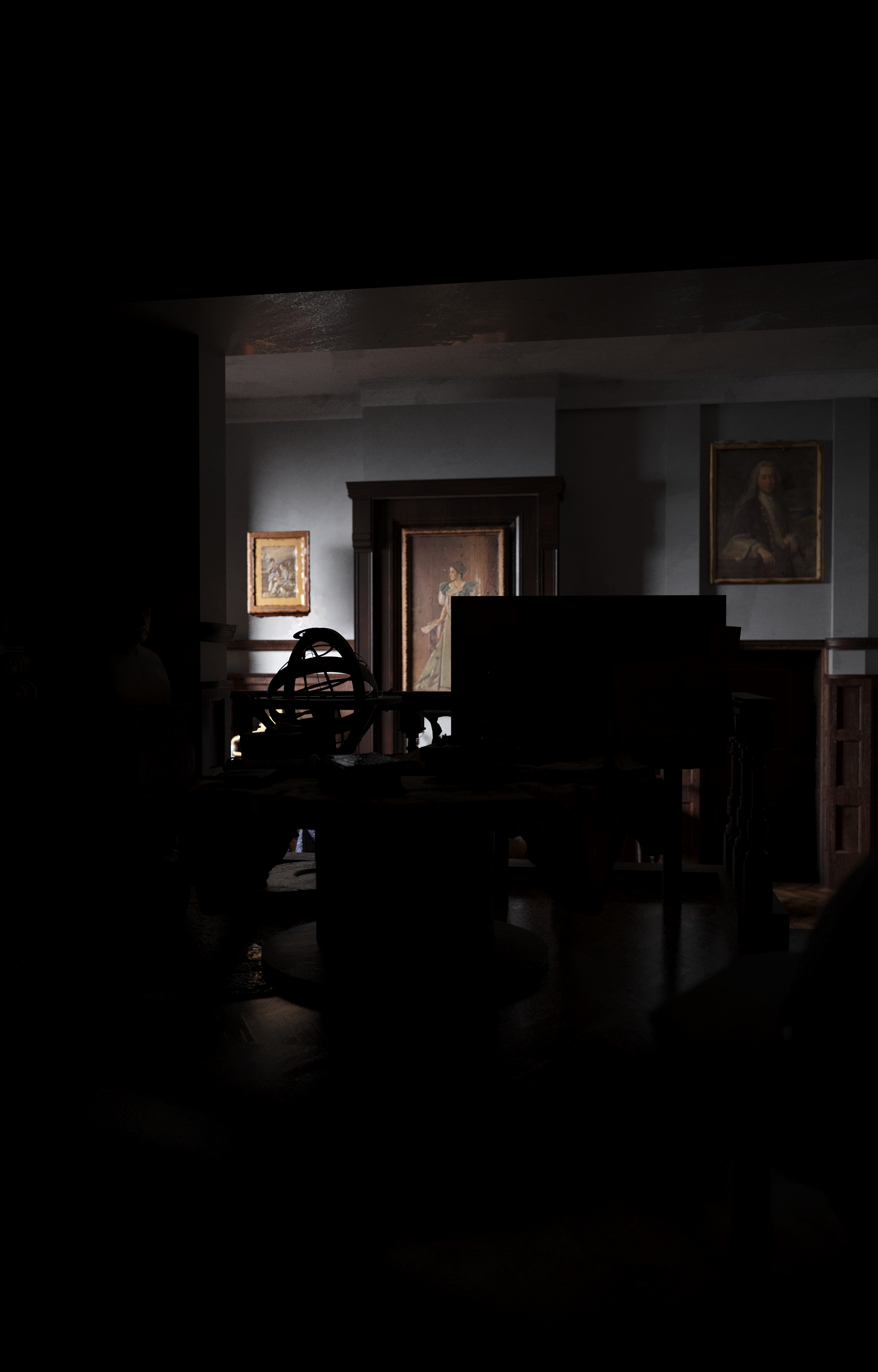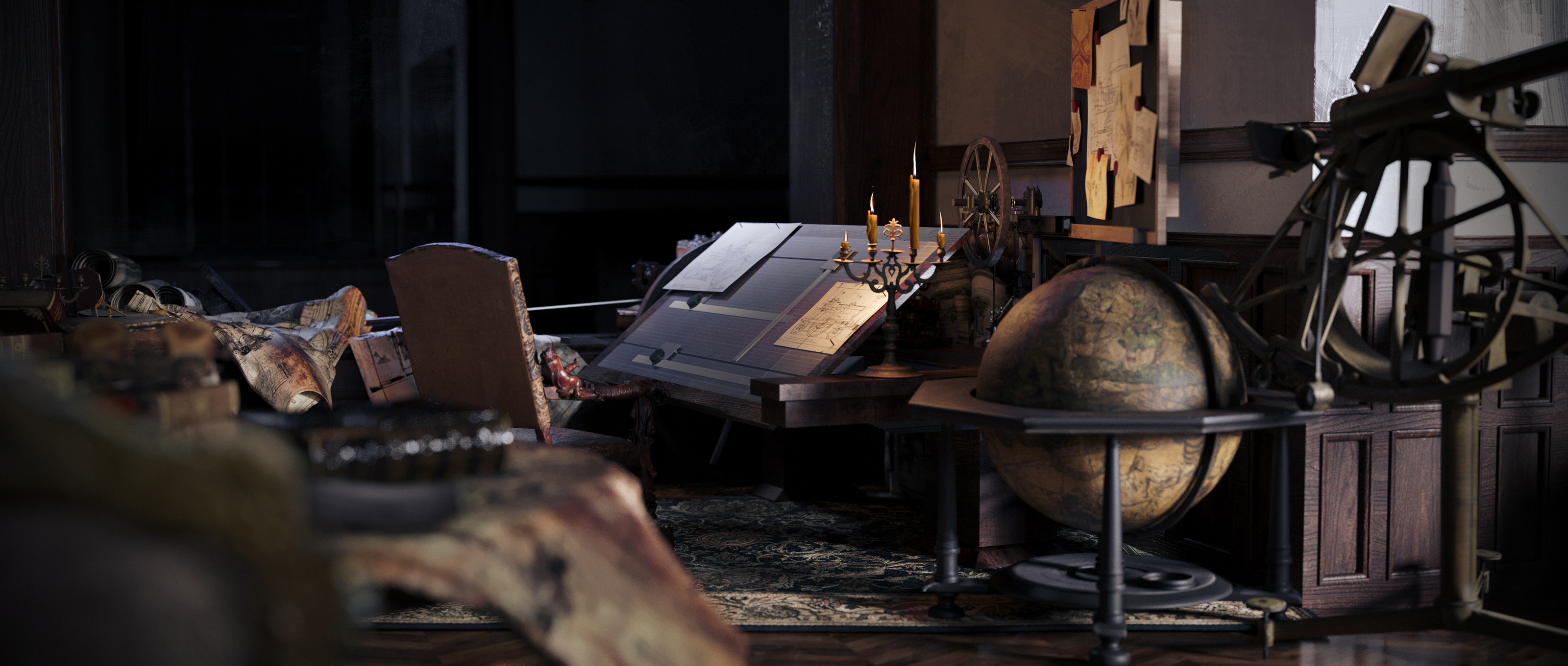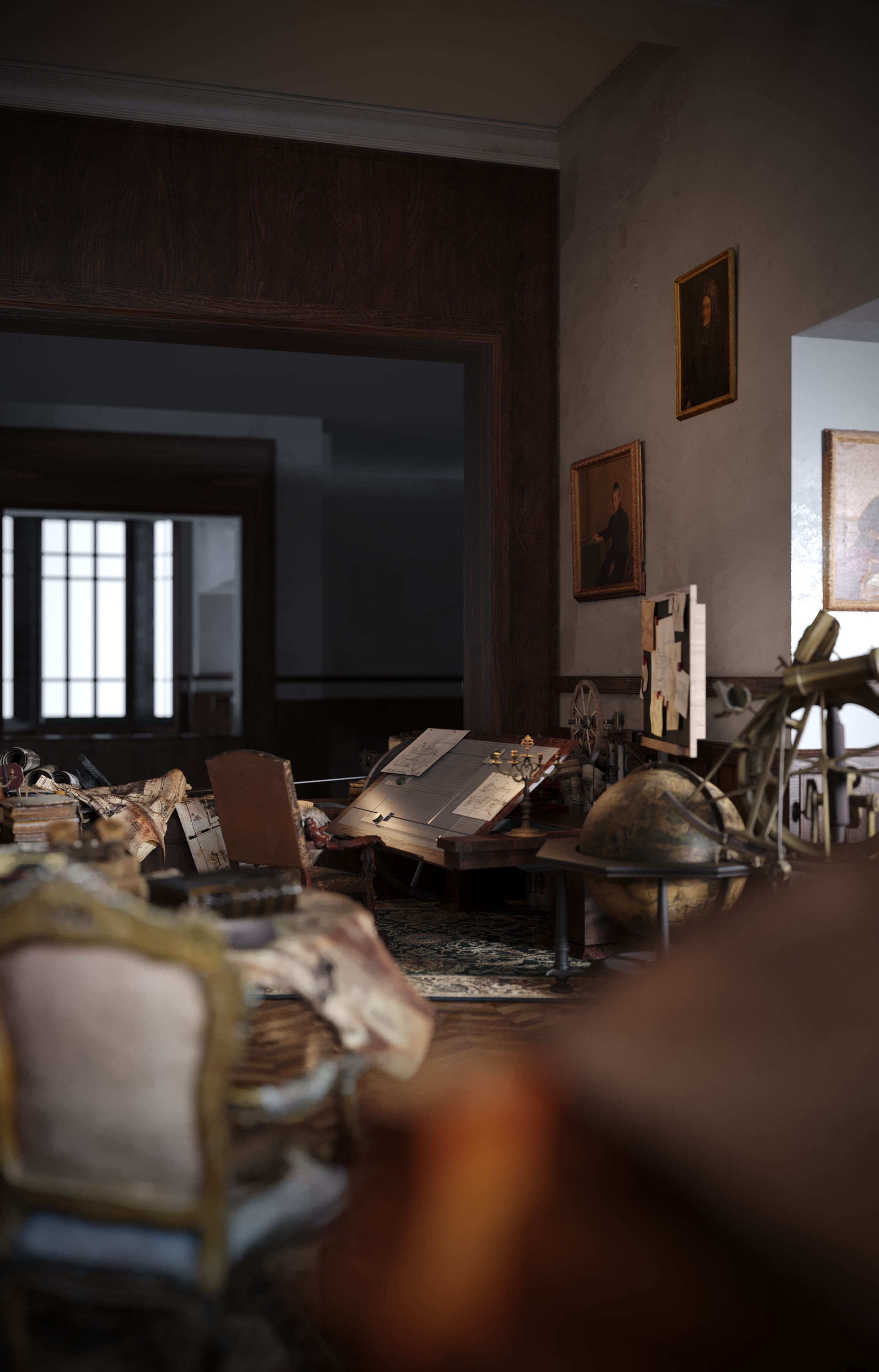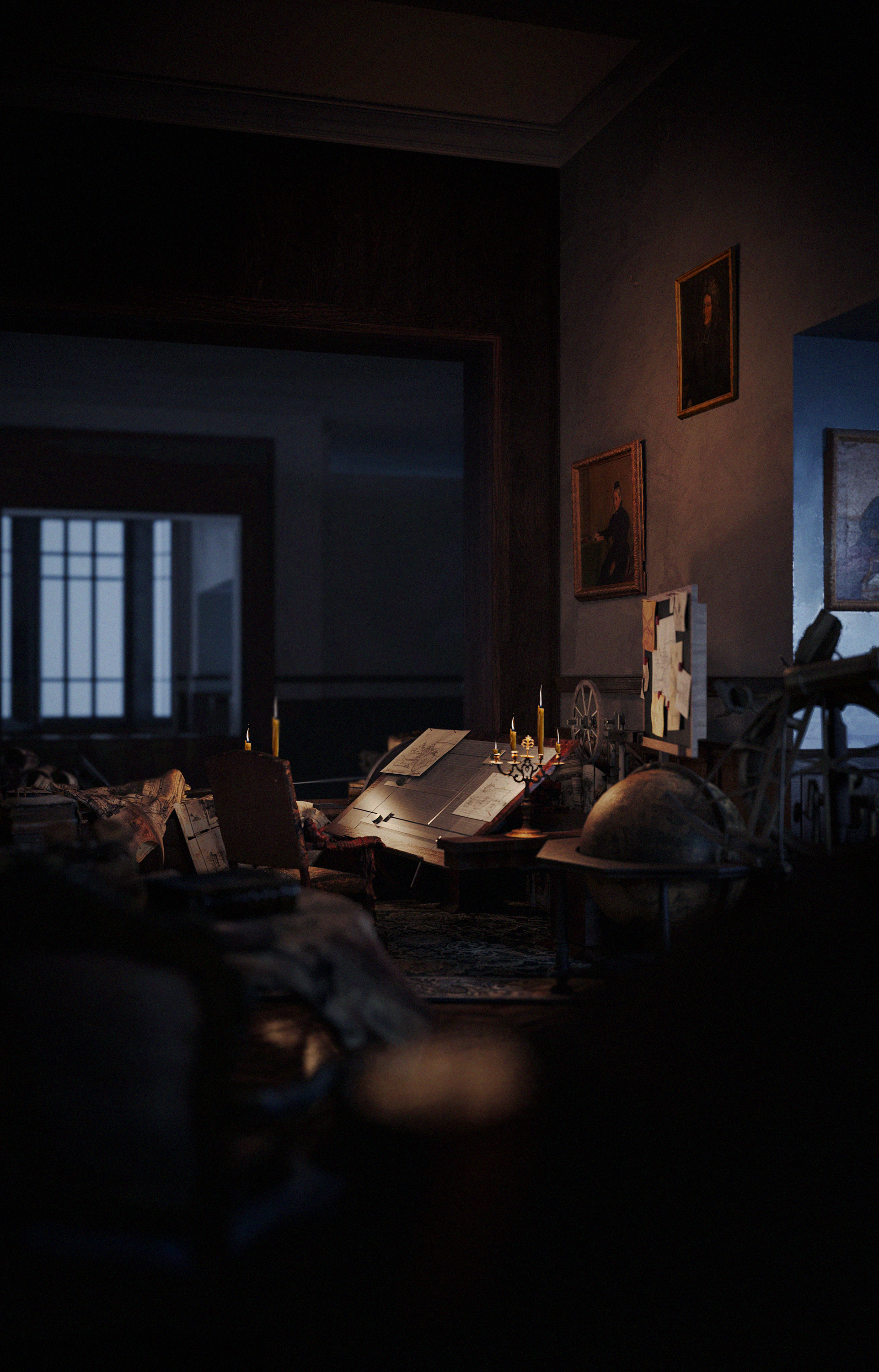 Слева от нас находится зона камина и мольберт с нарисованным портретом Ньютона, как дань уважения интеллектуальному гиганту прошлого. В глубине помещения мы можем увидеть небольшой склад механизмов. Здесь находятся ранние модели двигателей паровых машин, а также измерительные приборы