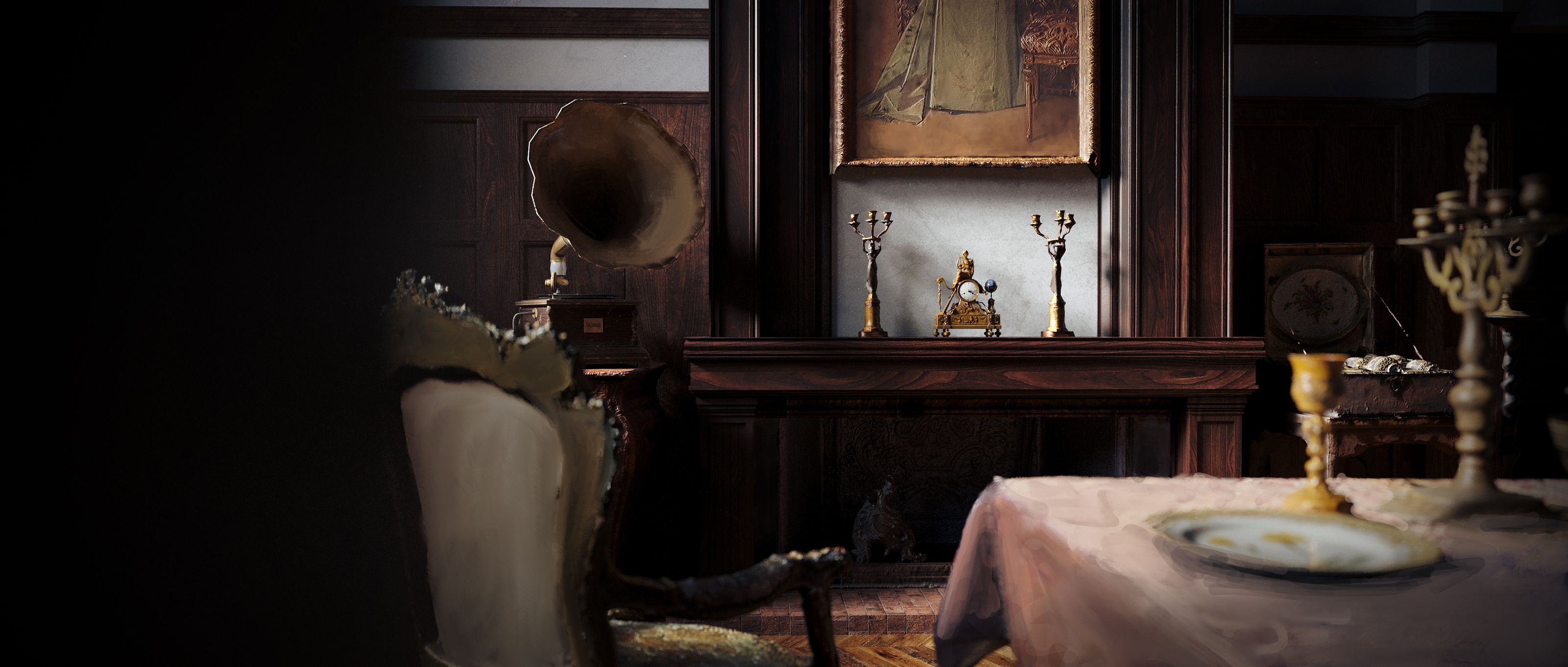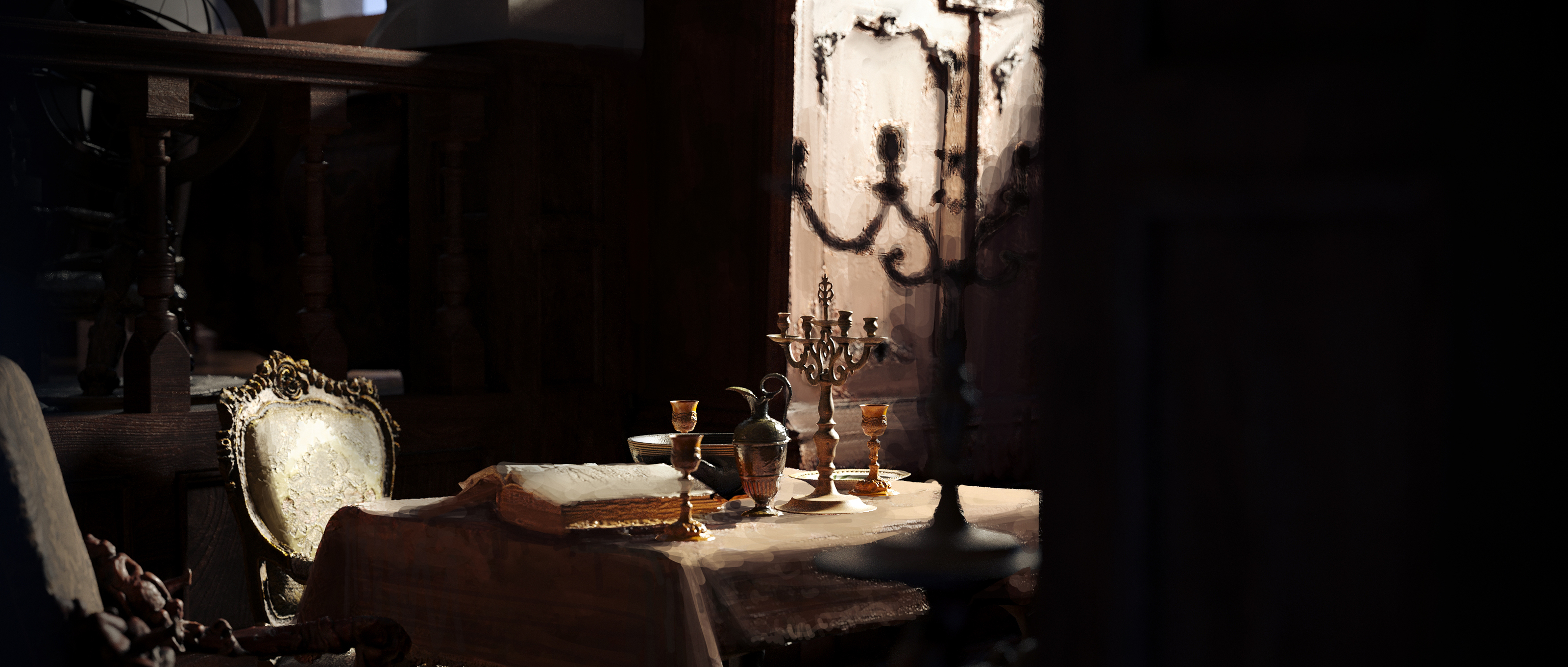 Ключевой кадр 04. Четвертый кадр переносит нас в обеденную зону, где стол занимает центральное место. А вокруг него богатые убранства, призванные подчеркнуть элегантность и утонченность нашего героя.