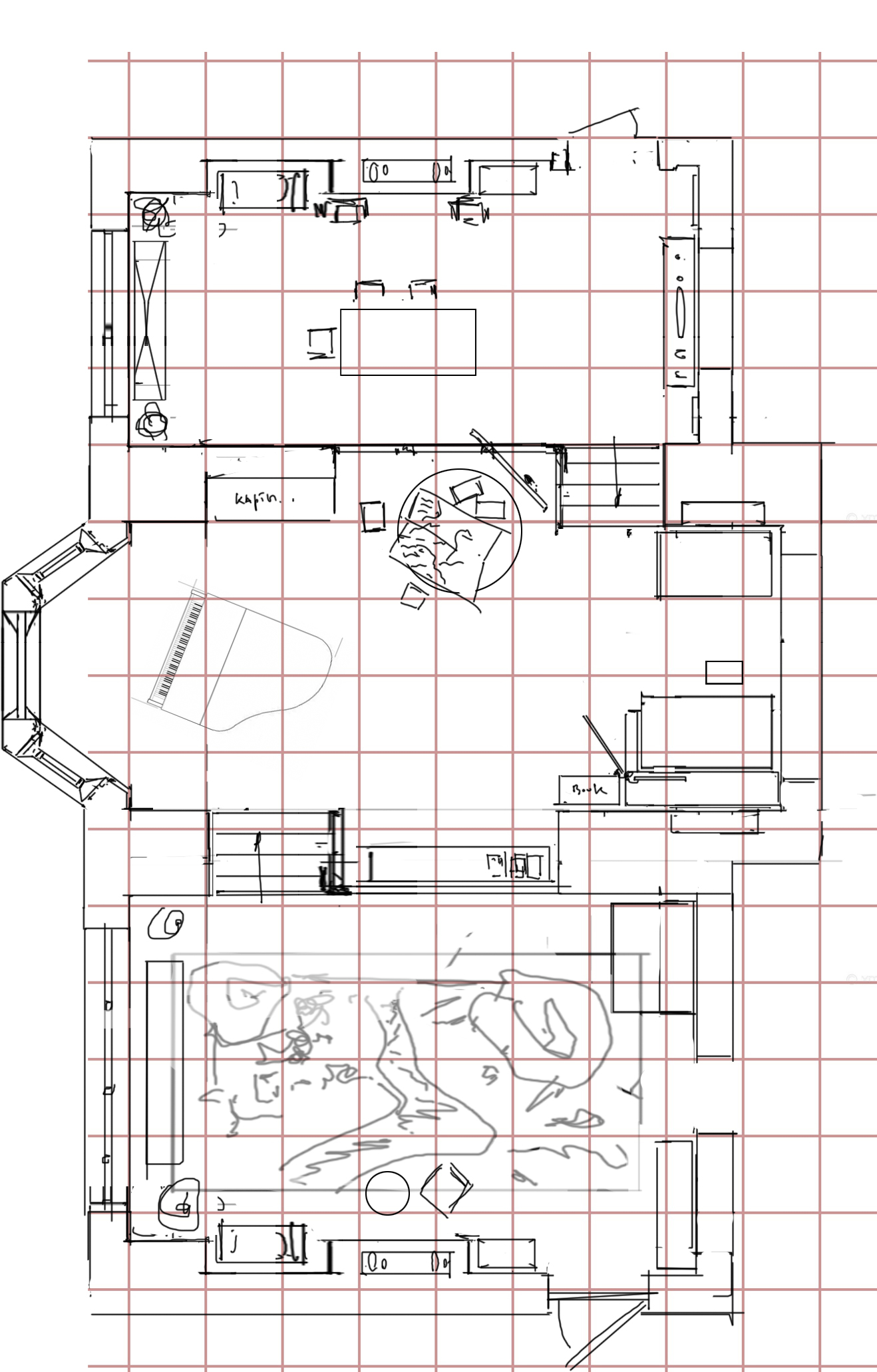 Скетчи. После небольшой подготовки я сделал эскиз плана помещения, а также пару зарисовок будущего интерьера в формате вида сверху в ¾
