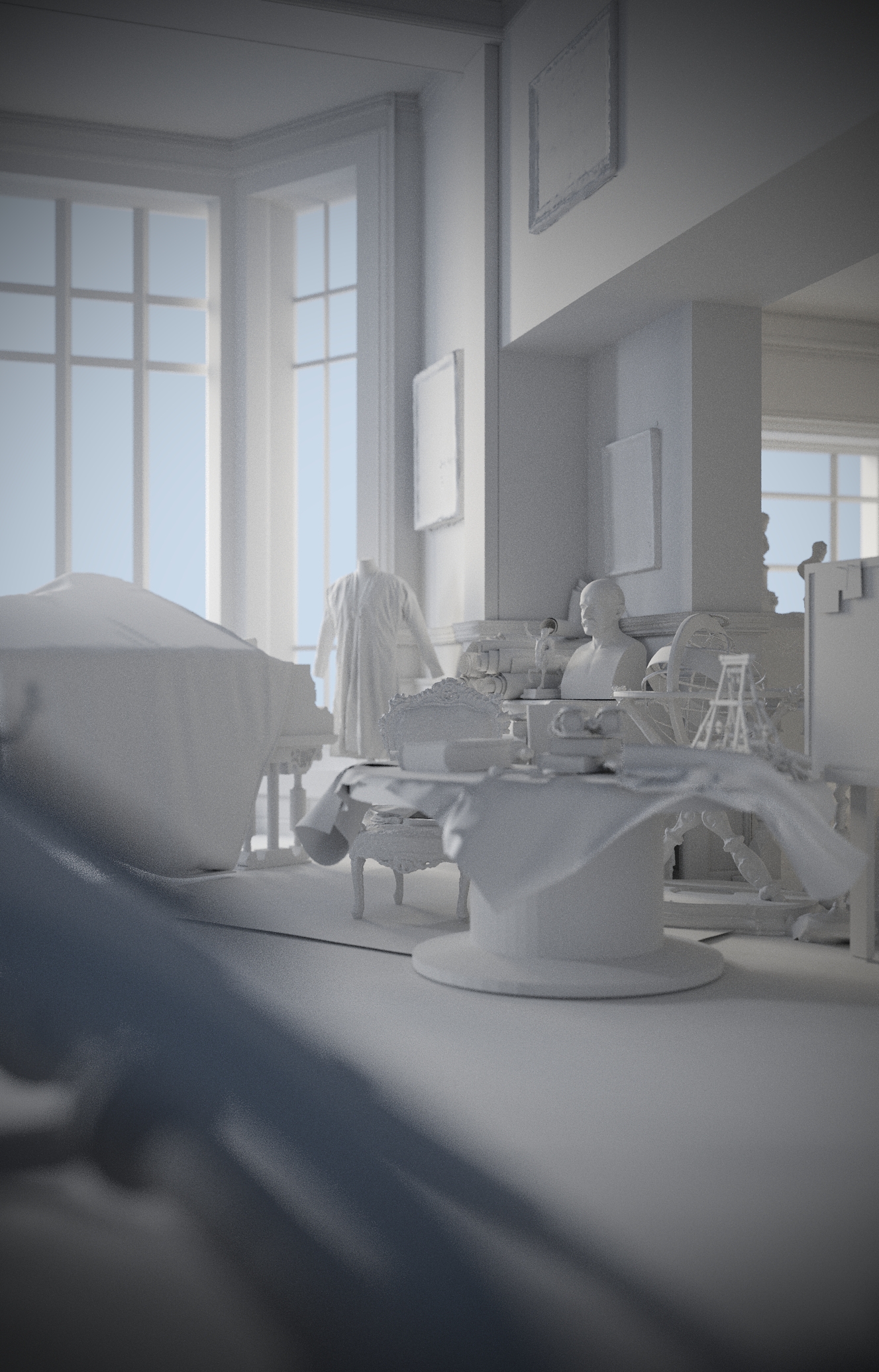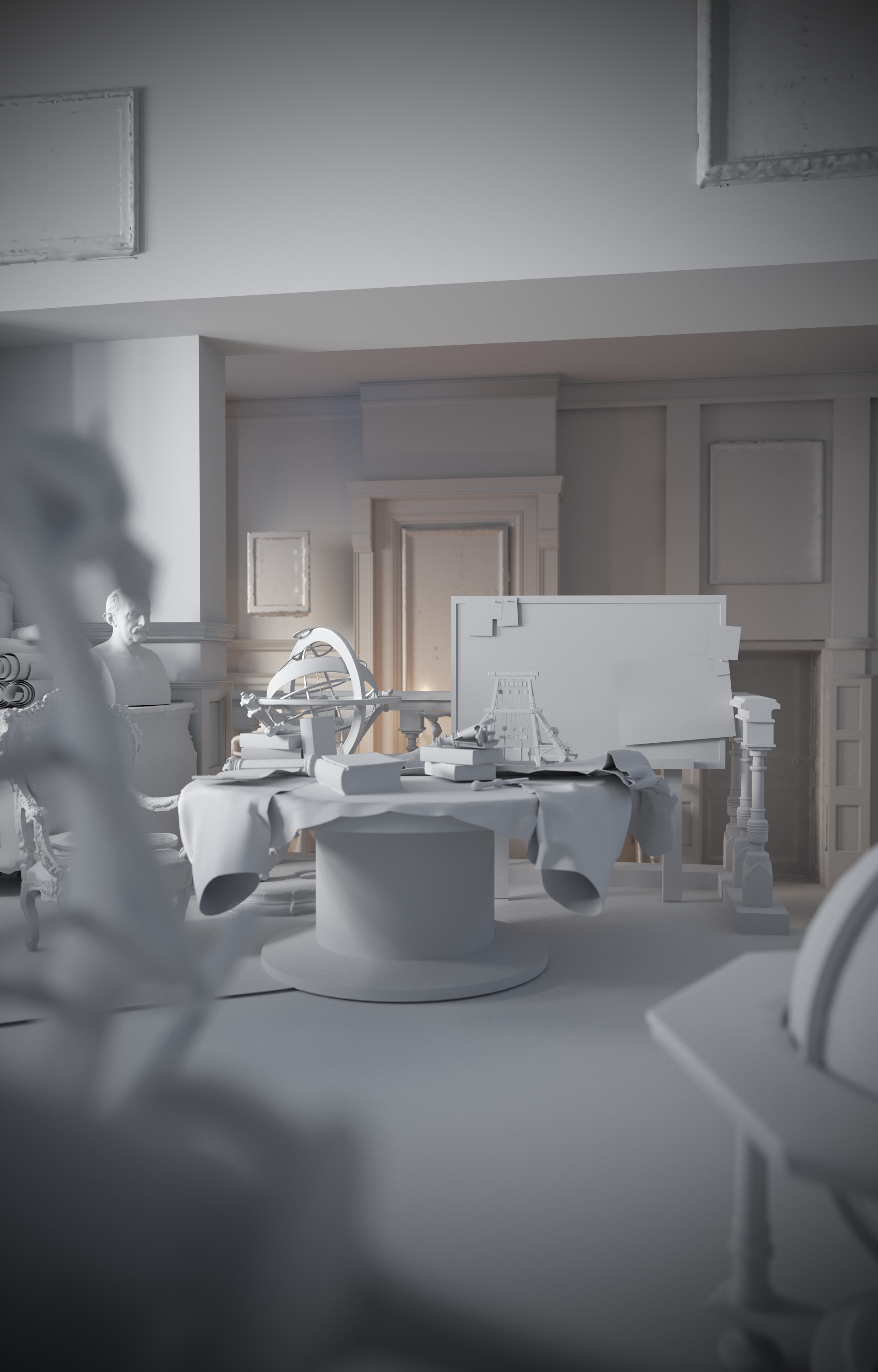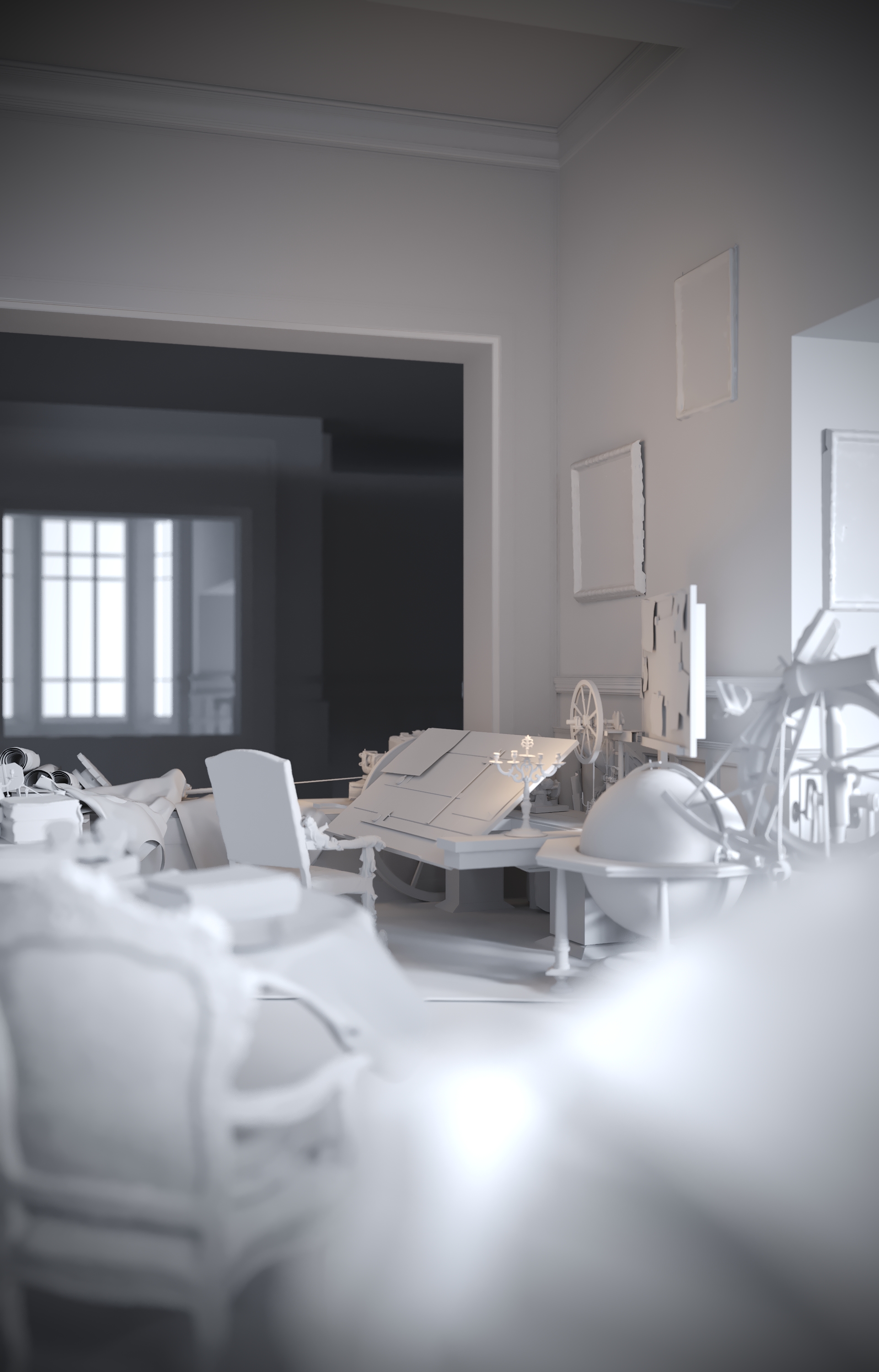 Ключевой кадр 02. Второй кадр показывает нам другую часть помещения, где наука и изысканность сливаются воедино. На переднем плане все тот же кульман, молчаливо следящий за своими братьями по оружию, а напротив него находится рабочий стол для исследований с небольшим беспорядком отражающим постоянную работу ума нашего героя.