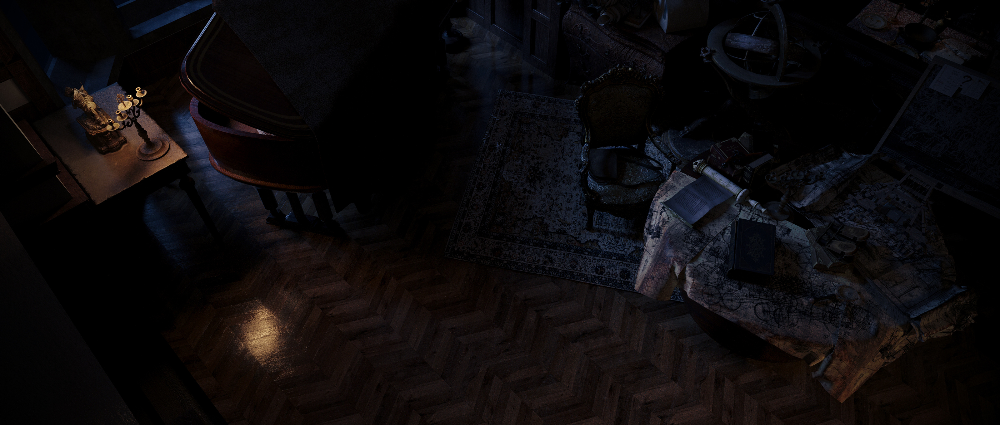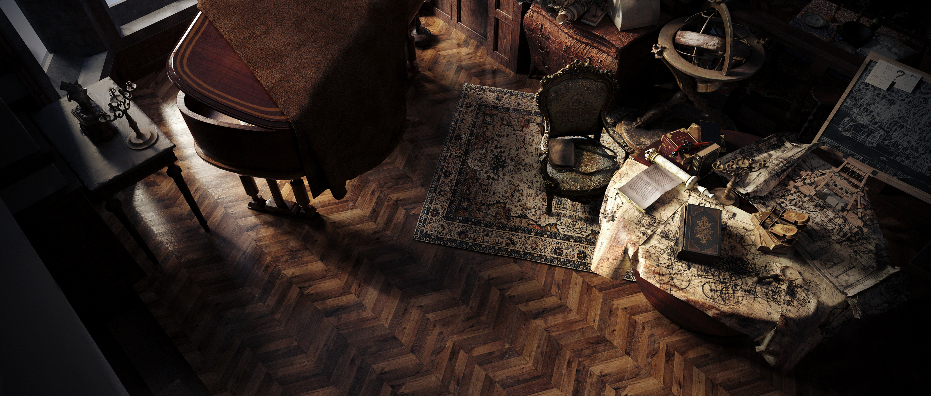 В конце помещения, в эркере, стоит рояль на колесах, накрытый бархатной тканью. Его присутствие символизирует гармонию между искусством и наукой, а также отражает многогранность нашего героя.