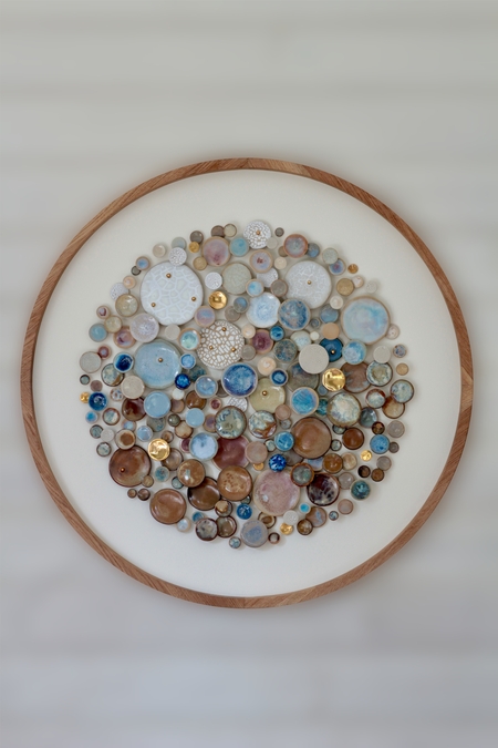 название: Керамическое панно Точки 2.0 «Земля, вода и воздух» создатель: Анна Кравченко, г. Великий Новгород год создания: 2024 г. техника: ручная лепка материалы: керамическая масса, глазури, препарат золота, рама из массива дуба размеры, вес: диаметр рамы 80 см., вес — 9,1 кг стоимость: 130 000р. целевая аудитория: интересующие дизайном и красивыми интерьерами люди, а также профессиональные дизайнеры, архитекторы, декораторы