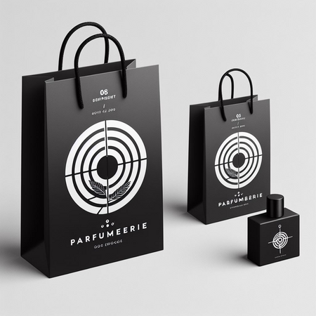 production hall with equipment for modern minimalist perfume with the inscription «Fatale Parfumerie» with serifs in black and white style with minimal illustration of the target in the middle of the bottle