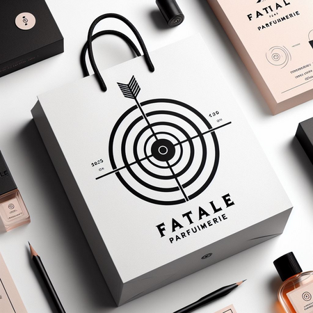 street advertising for modern minimalist perfume with the inscription «Fatale Parfumerie» with serifs in black and white style with minimal illustration of the target in the middle of the bottle