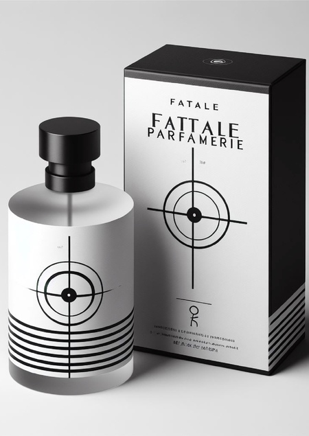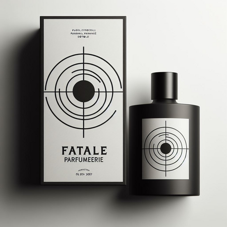 modern minimalist perfume with the inscription «Fatale Parfumerie» with serifs in black and white style with minimal illustration of the target in the middle of the bottle