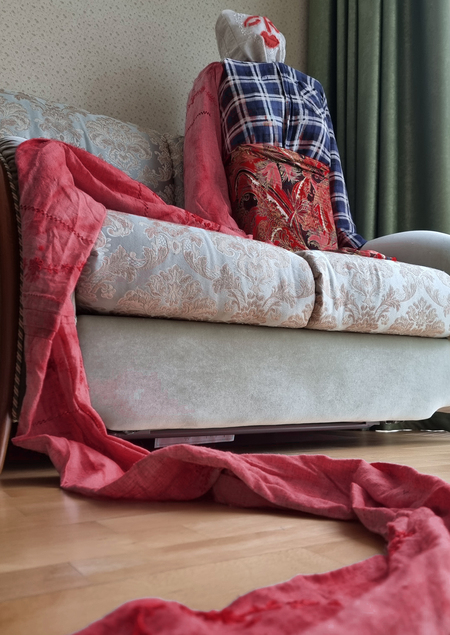 Проблема моего основного проекта — зависимости в целом. Для арт-объекта я выбрала частный случай — психологическую зависимость от партнера. Мой арт-объект является метафорой людей, зависимых друг от друга. Две фигуры по пояс, связанные между собой красным рукавом, как способ показать, что даже на расстоянии они не могут отпустить друг друга.