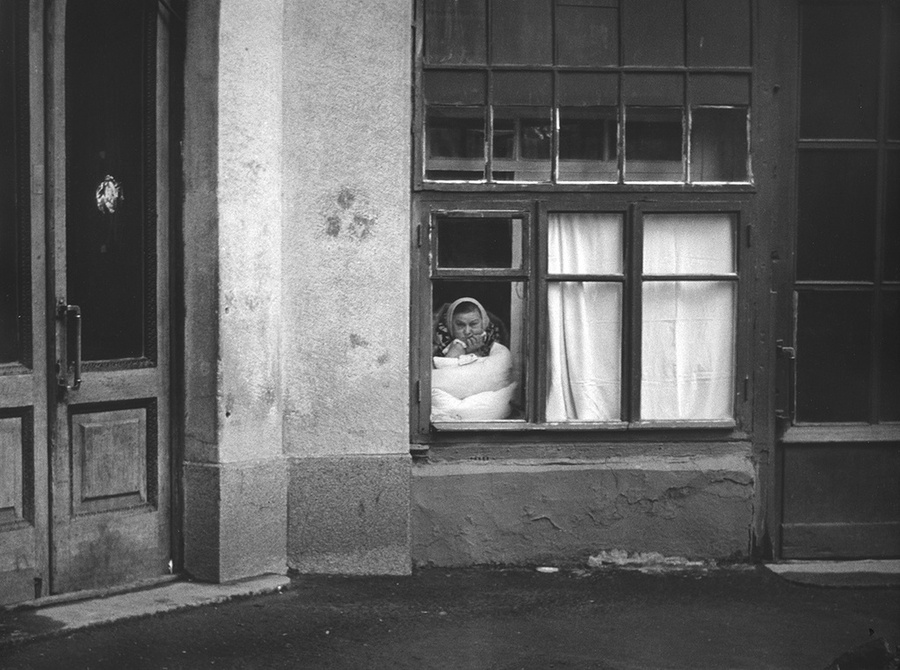 Из окна первого этажа выглядывает женщина в платке, опираясь на подушки. Её взгляд сосредоточен и недоверчив — она наблюдает за улицей и очевидно знает всё про всех.
