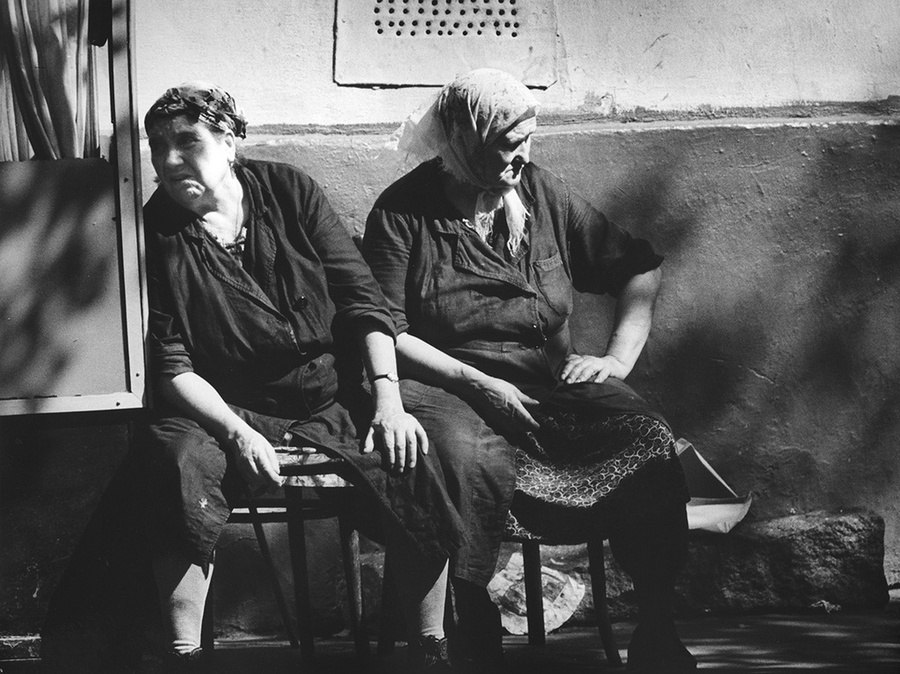 Две пожилые женщины в рабочей одежде следят за входом в туалет. Их позы полны усталости и житейской непреклонности: одна смотрит в сторону с выражением недовольства, другая — сосредоточенно, с руками на поясе. Снимок о характере, времени и достоинстве в скромных обстоятельствах. Грубоватая эстетика и мощная выразительность делают сцену почти скульптурной.