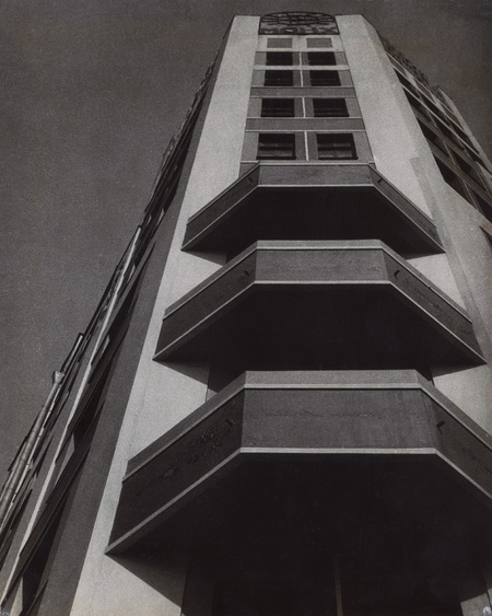 Снимок Родченко демонстрирует другую сторону той же эпохи — архитектурную дерзость и новаторство. Резкий нижний ракурс, устремлённый вверх, превращает здание Моссельпрома в символ конструктивистской мечты: строгие линии, ритмичные балконы, стремление ввысь. Это архитектура как лозунг, как вызов гравитации и традиции.
