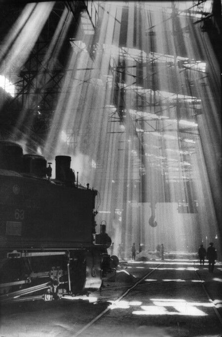 В кадре Скурихина — паровоз, рассекаемый мощными лучами света, пронизывающими пыльное пространство. Фигуры рабочих теряются в этом величественном индустриальном пейзаже. Эта сцена как икона первой пятилетки — напряжённого труда, света прогресса и индустриального подвига.