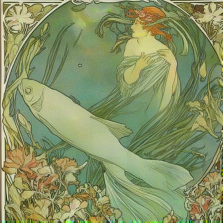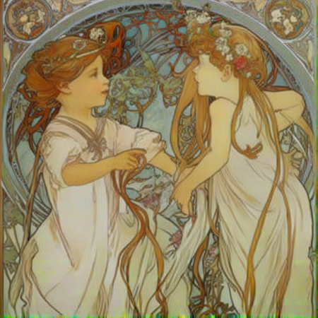 Нейросети демонстрируют неплохие результаты в передаче отдельных элементов стиля Альфонса Мухи, таких как растительные орнаменты, женские образы и пастельные тона.