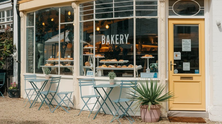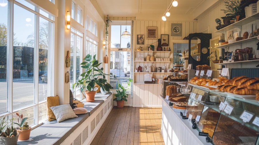 Промпт для второго изображения: A photo of the front side of a cozy bakery on a sunny day. The large windows allow natural light to fill the space. There are various baked goods displayed on a shelf, including croissants, bread, and cakes. The window seat is occupied by a potted plant. The walls are adorned with shelves and decorations. The floor is made of wooden planks. The overall ambiance is warm and inviting.