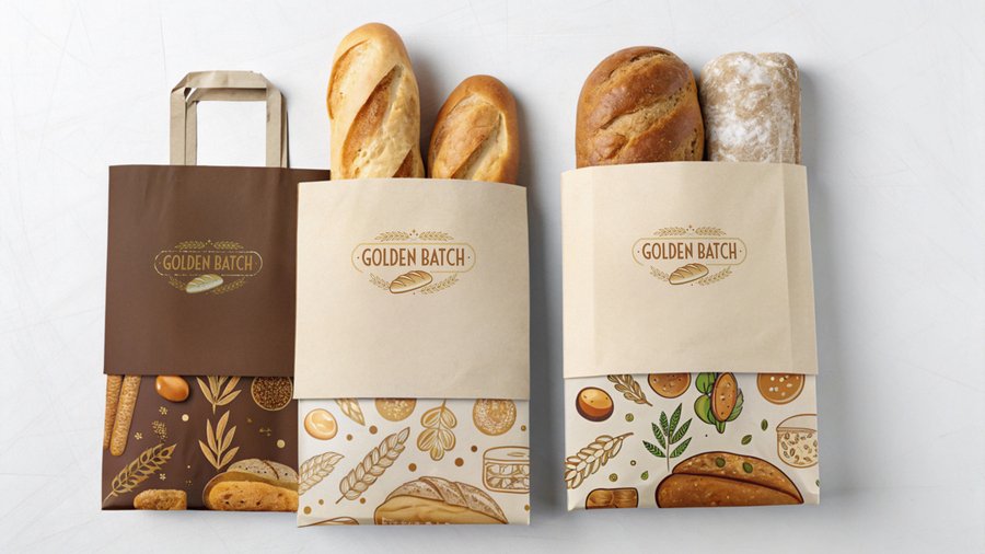 Промпт для второго изображения: Make a 3 empty paper variants of bread packaging full of bread for a bread bakery called Golden Batch.