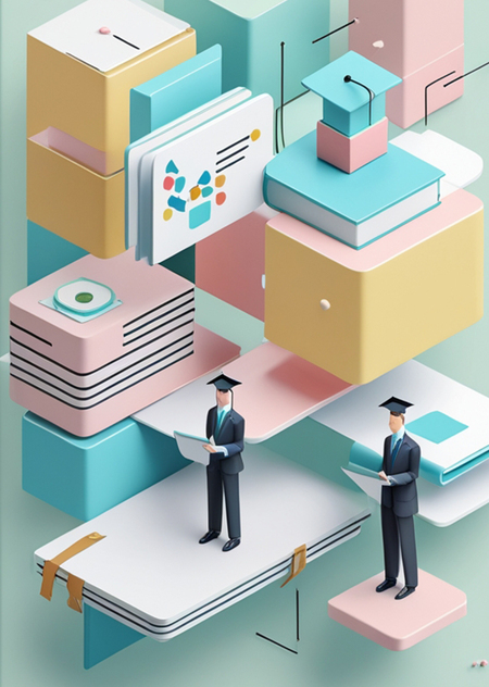 Вот использованный промпт: «A modern, geometric abstract cover design representing student success and career growth. The design should feature soft pastel colors, clean lines, and minimalistic shapes, symbolizing data analysis, education, and professional development. Incorporate elements such as subtle graduation caps, books, or abstract figures of students in a professional setting. The background should be light and airy, with a well-balanced composition. High resolution (1140×1600px), no text.»