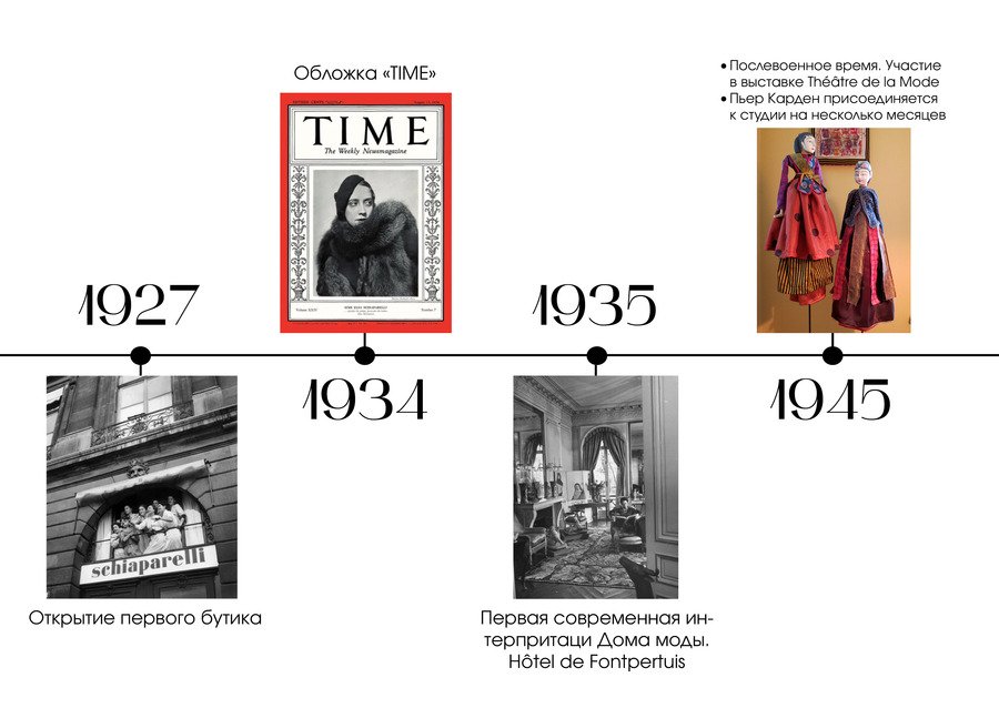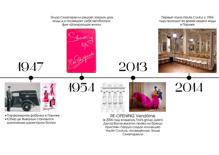 Бренд Schiaparelli основан экстравагантной француженкой Эльзой Скиапарелли в 1927 году. Изначально он был ориентирован на спортивную одежду и трикотаж. Первые кутюрные вещи Эльза стала создавать в 1930-х годах в качестве шуточных подарков. Её концепция заключалась в том, чтобы переложить сюрреалистические идеи на язык моды. Успех ей принесло платье с омаром, которое пожелала приобрести накануне свадьбы герцогиня Виндзорская — будущая супруга короля Великобритании Эдуарда VIII.