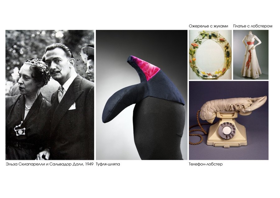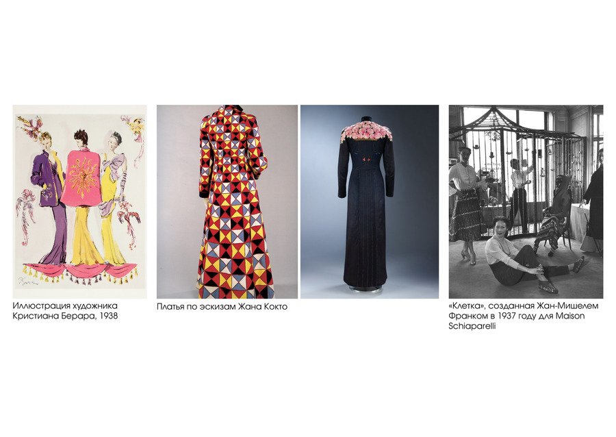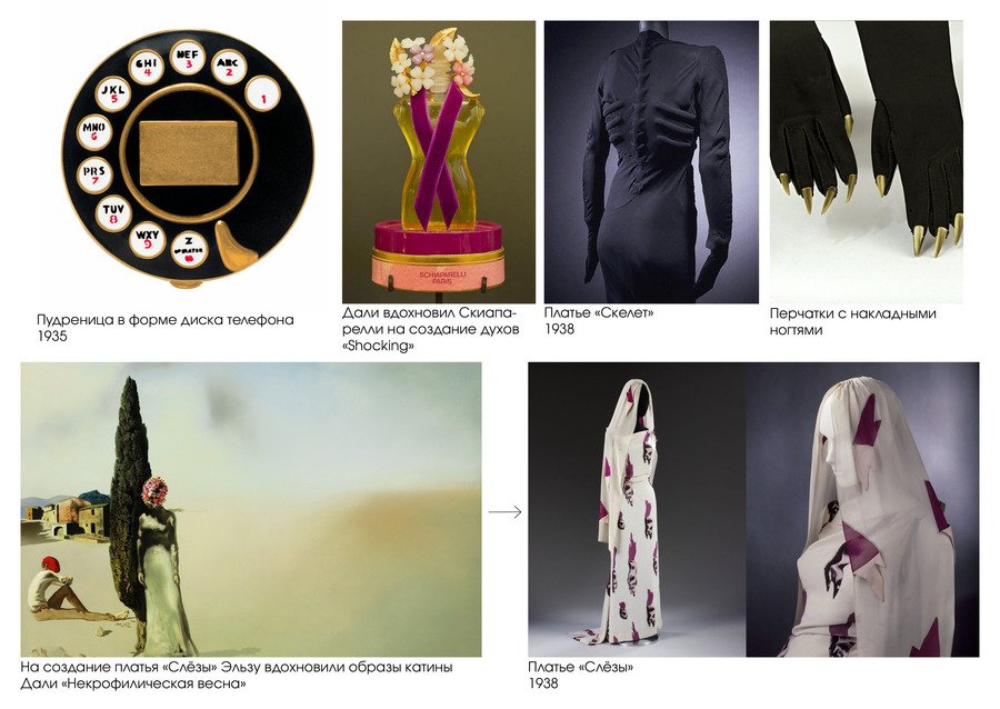 Сюрреализм: Эльза Скиапарелли была вдохновлена сюрреализмом, что проявляется в ее дизайне. Она использовала необычные формы, яркие цвета и неожиданные детали, такие как карманы в форме губ или платье с изображением костей.