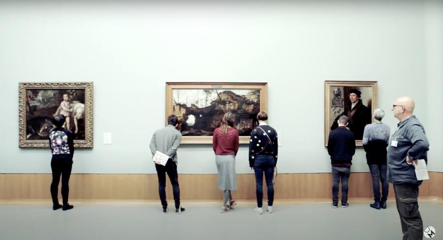 Вновь обратимся к теме физической усталости: здесь мы видим, как люди продолжают рассматривать и активно обсуждать картины, опираясь друг на друга спинами, тем самым облегчая свое состояние физической утомленности от постоянного нахождения стоя. Они как бы приглашают остальных задуматься над вопросом того, какие варианты взаимопомощи в пределах музея вообще возможны.