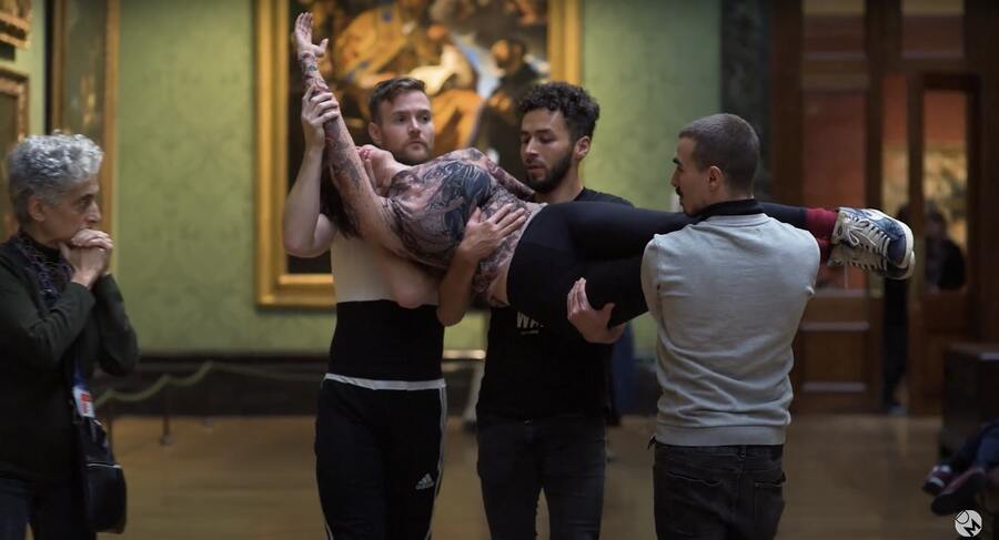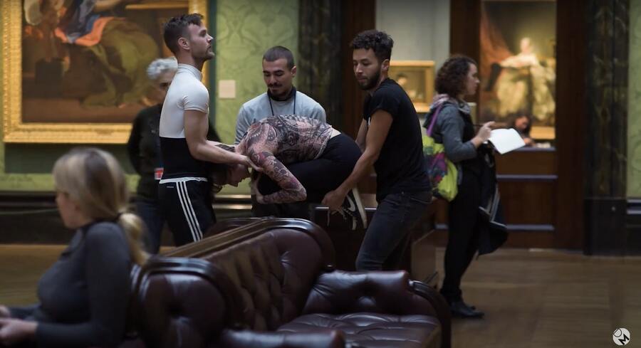 Тему утомленности в музейном пространстве продолжает фрагмент, в котором хореограф позволяют зрителю буквально повиснуть на нем, продолжая рассматривать холсты. Происходит размышление о том, что, скорее всего, иногда, перемещаясь по музею, каждому из нас хочется побыть ватным бессильным мешком и рухнуть всем своим весом кому-то на плечи, чтобы умиротворенно и абсолютно расслабленно разглядывать искусство.