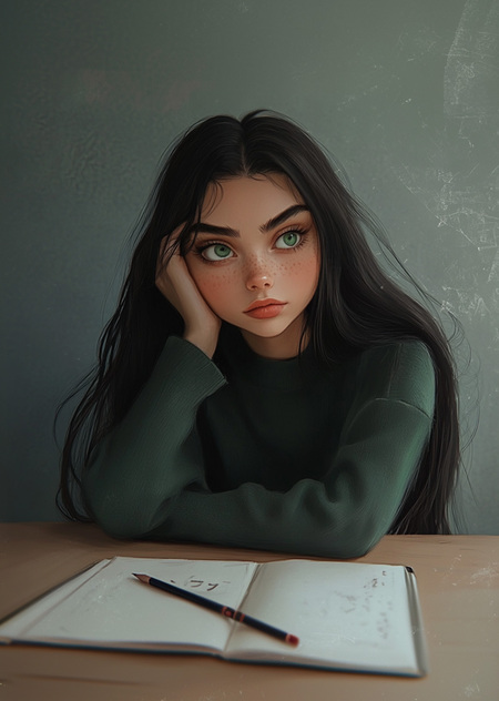 Запрос: /Imagine Create a girl who sits at her desk at school. Let her have dark hair and green eyes. Make it real --s 50 — style raw