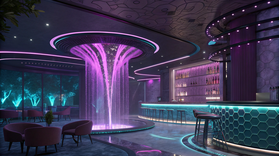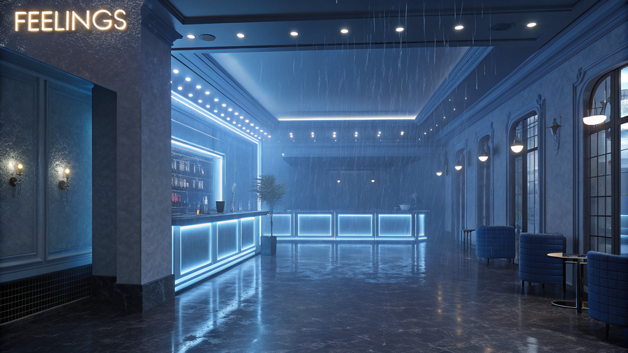 1. immersive emotional bar interior called «Feelings», futuristic design with a central glowing waterfall installation, main color theme purple with cyan and pink neon accents, reflective black surfaces, soft fog, abstract light patterns on the walls, fluid architectural shapes, glass and metal textures, cinematic lighting, cozy yet surreal atmosphere, modern furniture, high-end design, ultra realistic render, 8K, wide angle view 2. immersive room of anxiety in «Feelings» bar, deep red light, fragmented reflections, dynamic lighting that flickers slightly, sharp abstract shapes, dark fog, cinematic mood, futuristic psychological art installation, emotional tension, 8K hyperrealistic interior render 3. immersive emotional bar «Feelings», sadness-themed room with deep blue and silver tones, gentle rain or mist effect, soft lighting, minimalist design, reflective floor, quiet emotional ambiance, subtle neon accents, emotional architecture, realistic cinematic render, serene mood