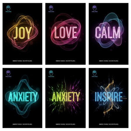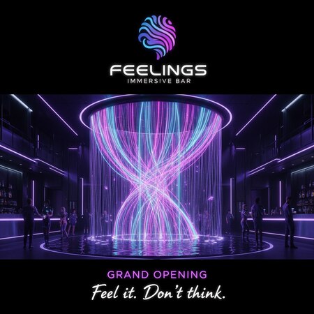 1. futuristic poster design for the grand opening of immersive bar «Feelings», include the uploaded logo, glowing purple waterfall installation inside modern bar interior, text «Grand Opening — Feel it. Don’t think.», cinematic lighting, neon reflections, black background, high detail, elegant modern composition, ultra realistic 8K render 2. et of futuristic promotional posters for immersive bar «Feelings», include the uploaded logo, each poster shows one emotion (JOY, LOVE, CALM, ANXIETY, INSPIRE), glowing neon word in center, matching gradient colors for each emotion, abstract flowing light textures, black background, cinematic glow, elegant modern layout, vector typography, high detail