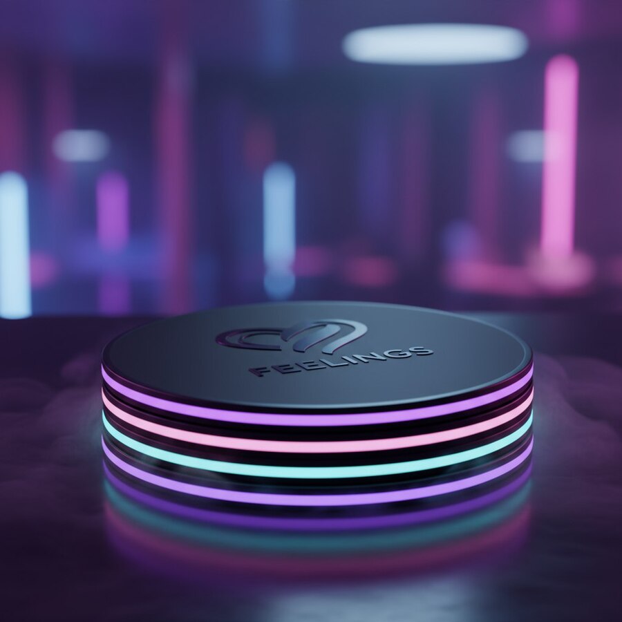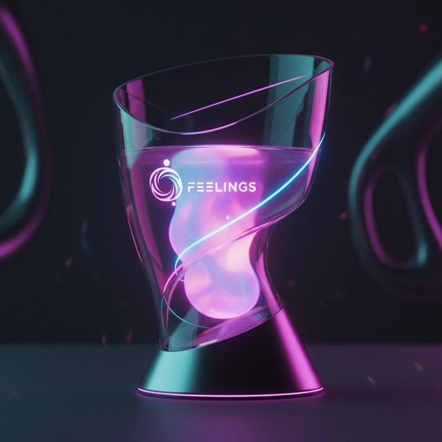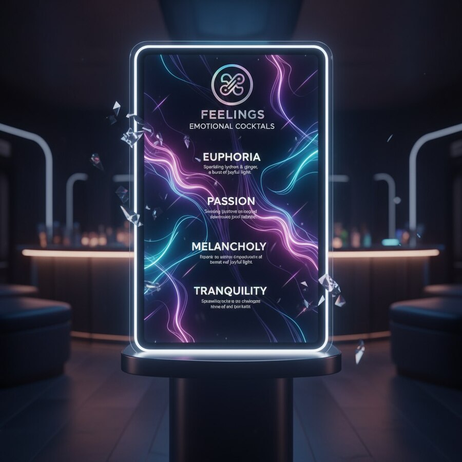 1. futuristic cocktail menu design for immersive emotional bar «Feelings», include uploaded logo, dark background with glowing gradient lines (purple, cyan, pink), minimal elegant typography, holographic effect on cocktail names, abstract light reflections, cinematic modern layout, luxury aesthetic, ultra realistic render 2. elegant futuristic coasters for immersive emotional bar «Feelings», include uploaded logo embossed or engraved, gradient glowing edges (purple, cyan, pink), dark matte surface, minimal circular design, cinematic lighting, ultra realistic product render 3. uturistic branded cocktail glass design for immersive emotional bar «Feelings», include the uploaded logo engraved or glowing on the glass, transparent curved shape with neon gradient reflections (purple, cyan, pink), glowing liquid inside, dark cinematic background, elegant minimal luxury aesthetic, product photography lighting, ultra realistic render, 8K