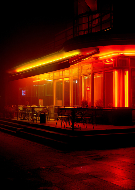 Promt: Night club, outside view, in neon color, dominated by red and yellow colors.