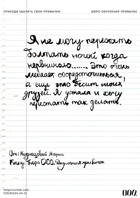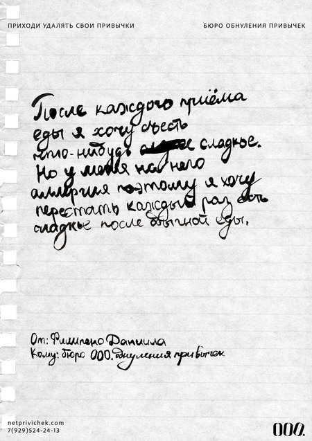 Бюро обнуления вредных привычек — уникальное место, где вам помогут удалить любого рода привычки, когда трудно избавиться от них самостояельно. Бюро «000.» — это про личность, про человека и сообщество единомышленников. В этом месте не просто помогают избавиться от привычек, тут также находят друзей по интересам.