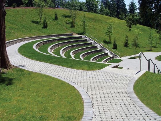 Зона массовых мероприятий встроена в рельеф. Площадка для выступлений расположена в центре, вокруг места, которые поэтапно поднимаются вверх, открывая обзор выше сидящим.