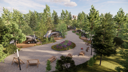 Несколько домов с террасами и изолированными двориками создают базу для отдыха, расположенную в окружении парка. Общая площадь содержит гамаки, костровище, столы для посиделок. Внутри каждого дома на 1-2 человека расположены кухня, спальня, зоны хранения и рабочее место. Окна, выходящие на улицу, отражают свет и обеспечивают приватность для посетителей.