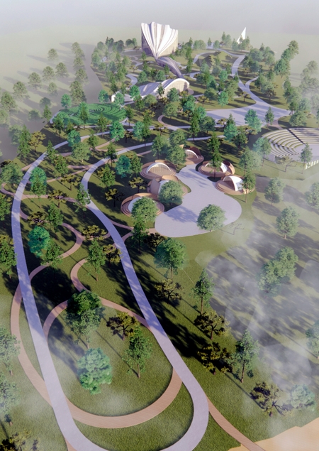 Форма кривой спирали. Посетители смогут пройти по извилистым тропам, наслаждаясь уникальными видами на окружающий пейзаж парка, и достичь вершины, которая является смотровой площадкой.