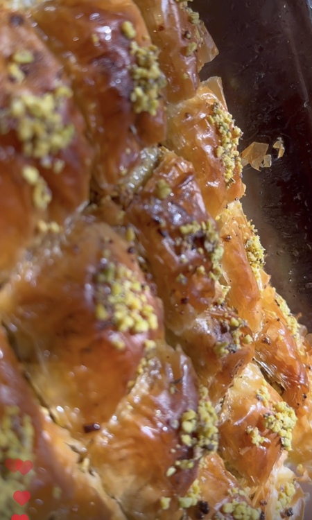 1 упаковка тесто филы для баклавы 250 гр растопленного сливочного масла 200 граммов очищенных фисташек Для сиропа 250 гр сахара 300 мл воды 2 ч л лимонного сока В маленькой кастрюле растопить сливочное масло, до шоколадно коричневого цвета. Измельчить фисташки в блендере. Тесто фило обрезать под форму для выпекания. Выложить первый лист на противень и смазать его сливочным маслом, повторить действие с 12 листами теста, смазывая каждый топленным маслом. Как только будет 12 слоев для нижней части, выложить начинку из фисташек и равномерно распределить повсюду, не прижимая (оставить небольшую часть фисташек для украшения). Края теста, которые срезали можно выложить над фисташками ровным слоем и полить маслом, затем оставшиеся 10 листьев теста также выложить смазывая каждый раз маслом. Нарезать тесто на ровные квадратики (лучше всего это делать очень острым ножом). Выпекать в разогретой до 190С духовке 25-30 минут до золотистого коричневого цвета. В это время, в сотейнике соединить воду, сахар и лимонный сок. Варить постоянно помешивая на среднем огне в течение 15-20 минут, не кипятить. Залить баклаву сиропом украсить оставшимися фисташками.