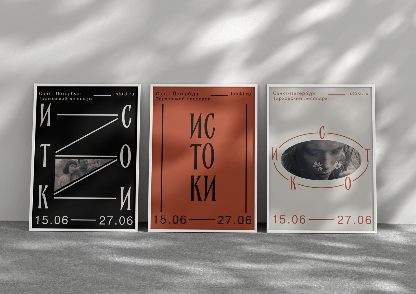 промпт — Interior office wall with framed «Rooted» festival posters and moodboards. Natural textures — plaster, wood, and linen fabric. Subtle warm light, calm composition, organic branding aesthetic. (Nano Banana)