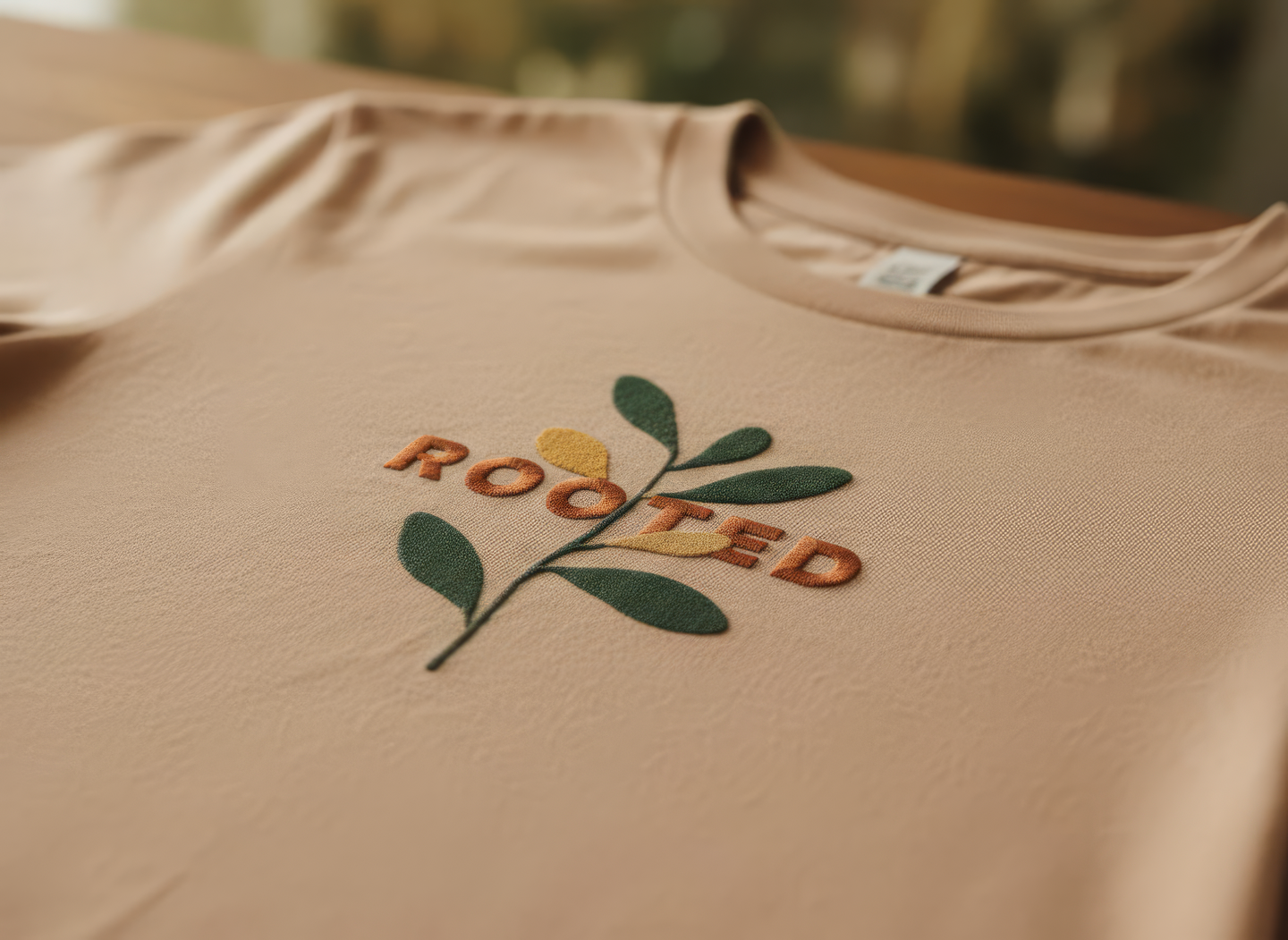 промпт (футболка) — Minimalist embroidered t-shirt for «Rooted» festival. Natural cotton or linen texture in soft beige or clay tone. The «Rooted» logo stitched in warm terracotta thread on the front. Gentle lighting, shallow depth of field, warm natural background. Feels effortless, contemporary, grounded in nature. (Nano Banana)