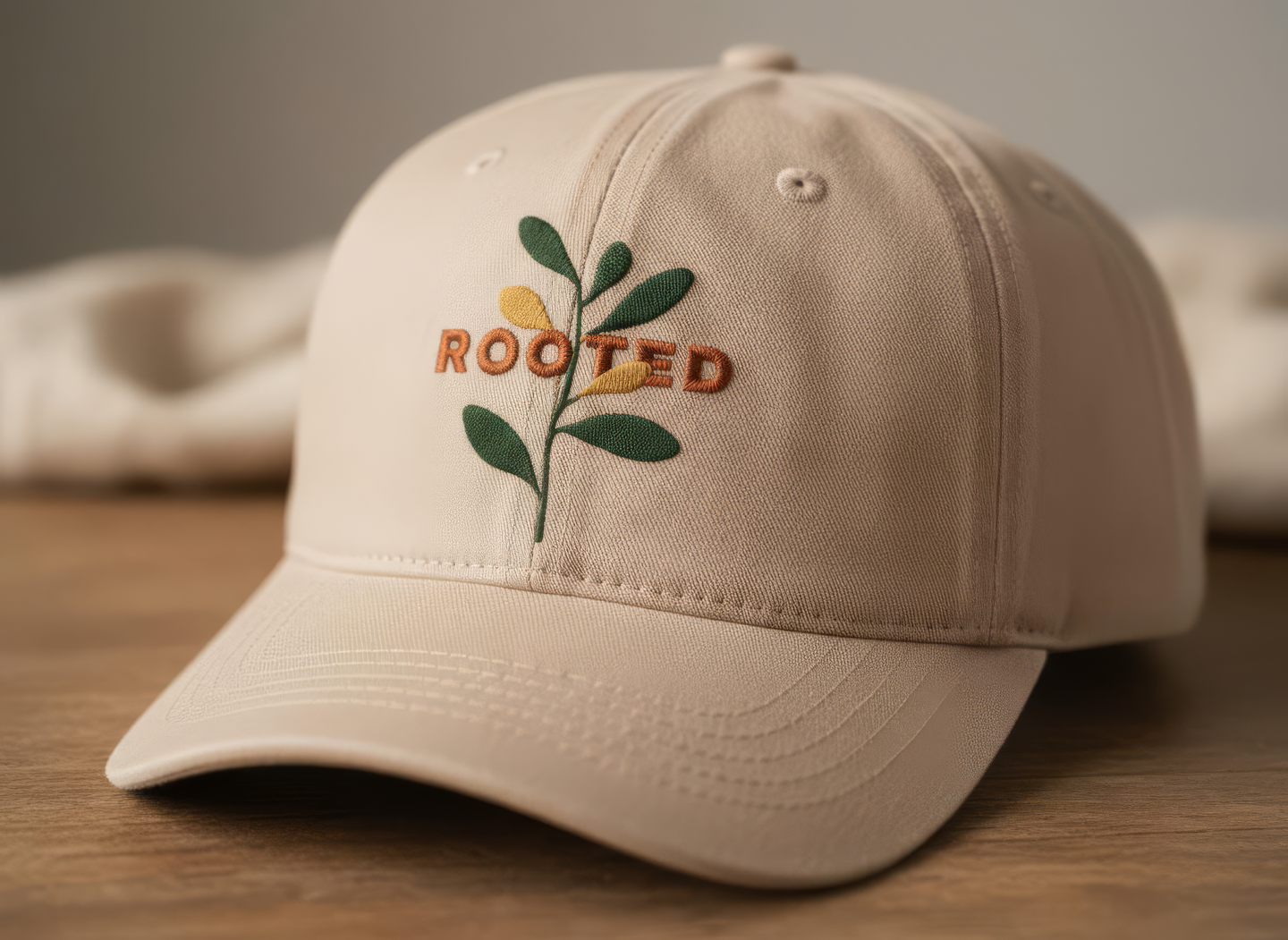 промпт (кепка) — Minimalist embroidered cap for «Rooted» festival. Natural cotton or linen texture in soft beige or clay tone. The «Rooted» logo stitched in warm terracotta thread on the front. Gentle lighting, shallow depth of field, warm natural background. Feels effortless, contemporary, grounded in nature. (Nano Banana)