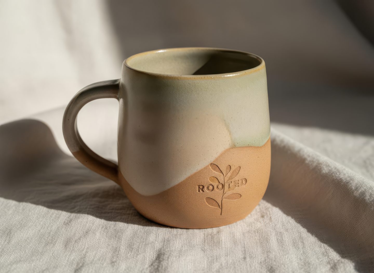 промпт (кружка) — Close-up product photo of a handcrafted ceramic mug for the «Rooted» festival. Minimalist modern design, matte glaze in warm earthy tones — clay, beige, and muted green. The «Rooted» logo appears subtly engraved or embossed near the base. Organic curves, natural texture, slightly imperfect hand-finished surface. Styled on a linen cloth with soft daylight and natural shadows. Feels calm, grounded, and artisanal. (Nano Banana)